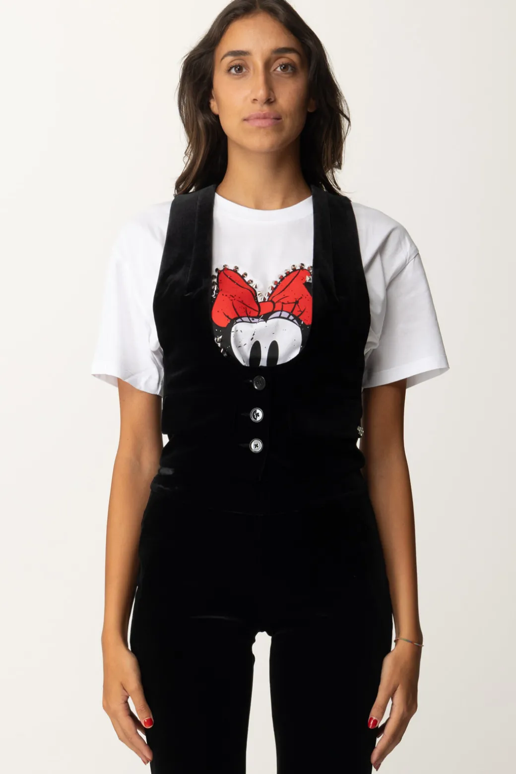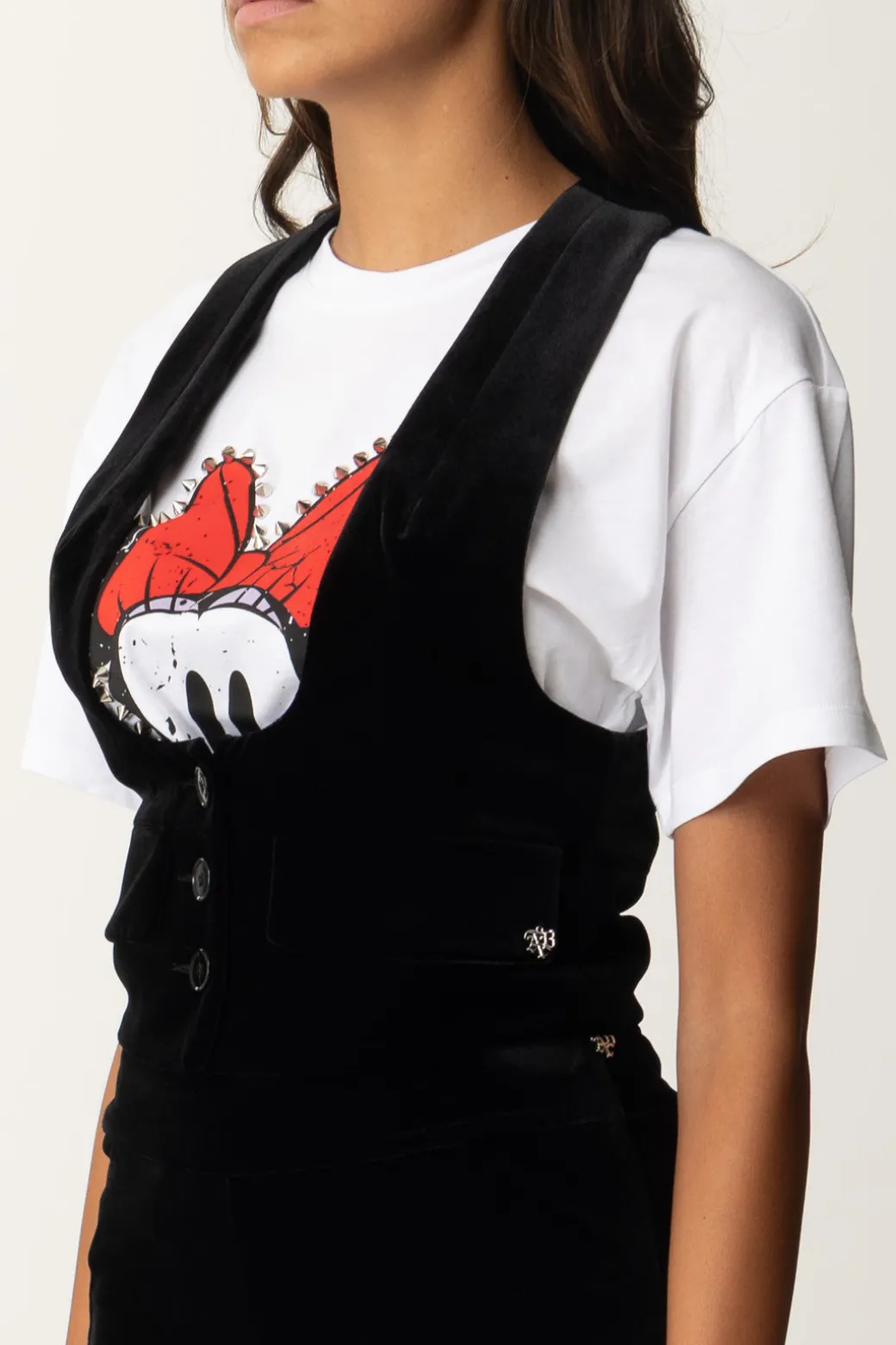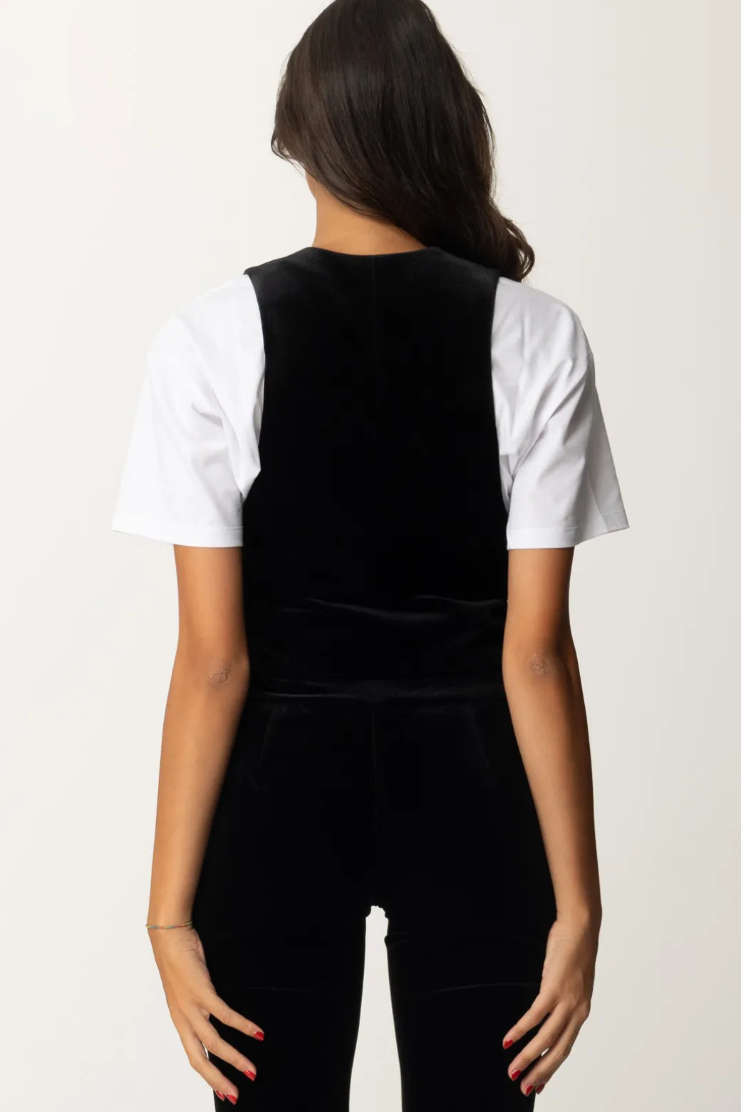 Un Gilet Aniyeby dal taglio classico, realizzato in velluto che aggiunge un tocco di eleganza a qualsiasi outfit. La chiusura a bottoni e la linea strutturata offrono un look raffinato. Un capo versatile che si adatta a diversi stili: per un look casual-chic, indossalo con una t-shirt grafica e jeans skinny per, oppure, per un’occasione più formale, prova a sovrapporlo a una camicia bianca abbinata a pantaloni sartoriali e mocassini.