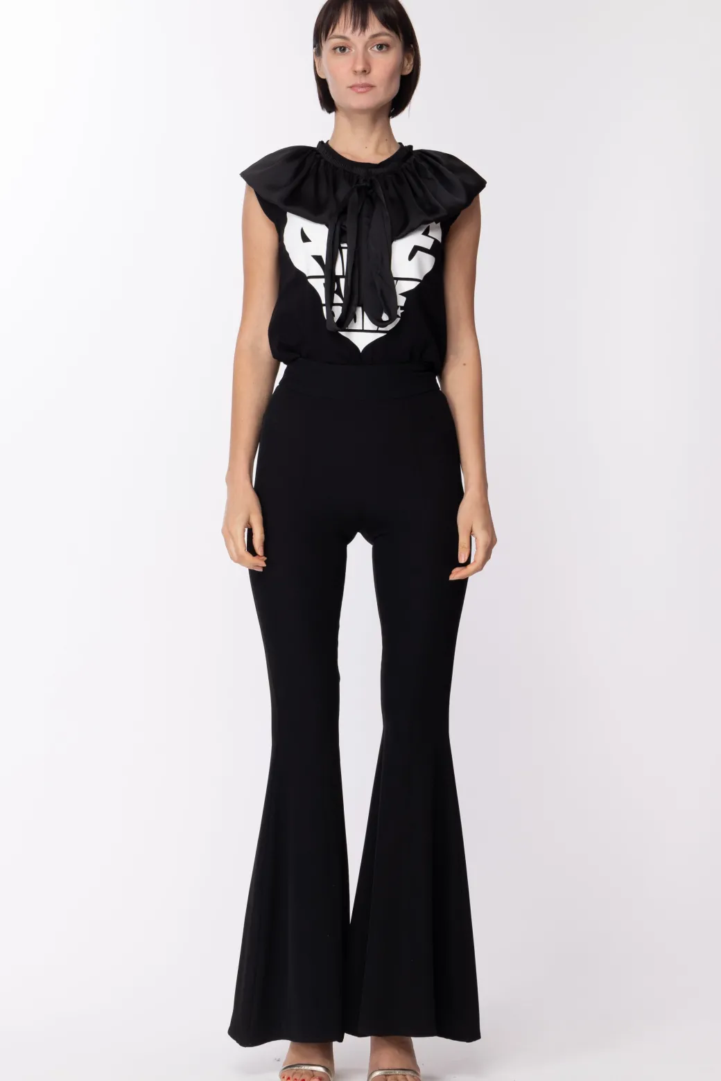Di certo estrosa, una t-shirt Aniye by he mette insieme una stampa grintosa – il cuore con logo lettering che troviamo anche in altri capi – ad un motivo classicheggiante, come l’ampio volant con nastro che dal colletto si adagia sulle spalle, creando un contrasto unico nel suo genere!