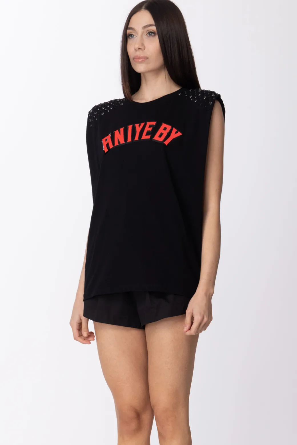 T-shirt Aniye By che racconta il mood casual del brand ma anche la sua ispirazione un po’ vintage, a partire dalle spalline imbottite. Stampa del logo sul petto a contrasto, piccole borchiette ricoprono le spalle sottolienandone l’animo rock.