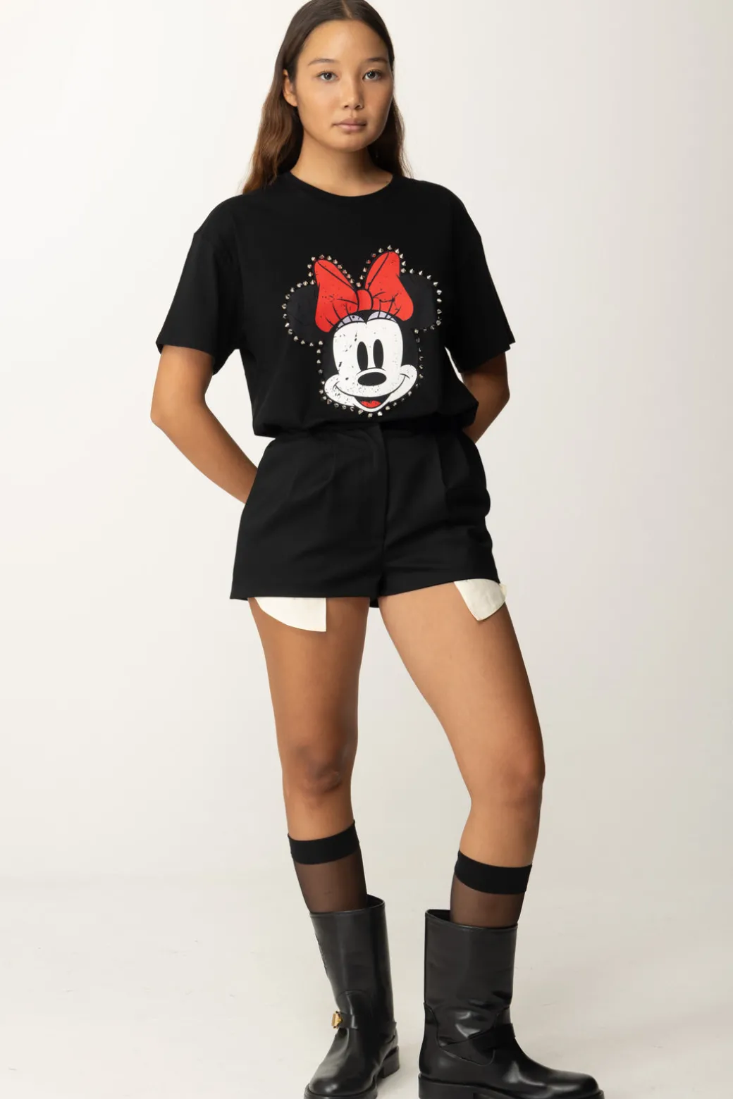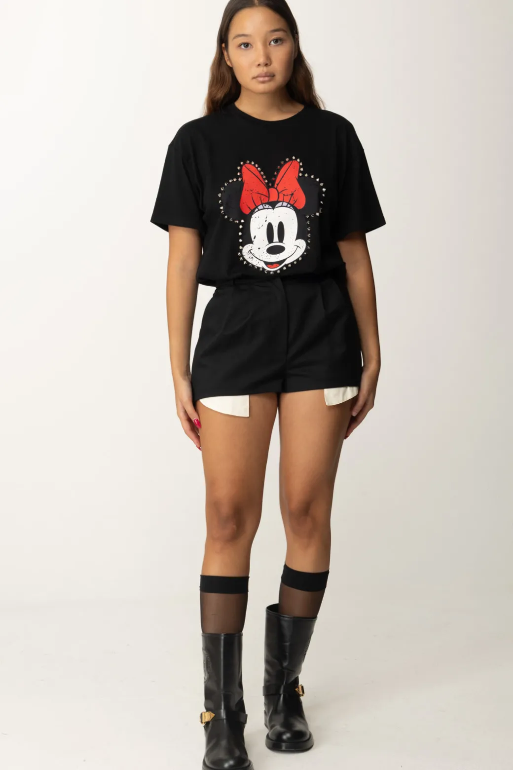 Una rivisitazione in chiave un po’ gothic di un grande classico per tutte le età: il volto di Minnie con il suo riconoscibile fiocco campeggia su questa t-shirt Aniye By, ma contornato da borchie e con un effetto used che ne completa l’allure un po’ rock. Fit comodo, perfetta per aggiunger un tocco di originalità anche ai tuoi outfit più rilassati.