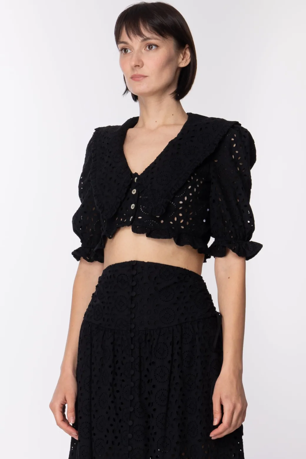 Manichette a sbuffo e ampio colletto insieme al dolce Sangallo creano un fantastico contrasto con la sensualità del taglio crop e della schiena scoperta: un top Aniye By che potrai indossare con i tuoi denim short preferiti o una gonna lunga a vita alta e sandali in rafia per darti un’aria un po’ boho, perfetta per l’estate.