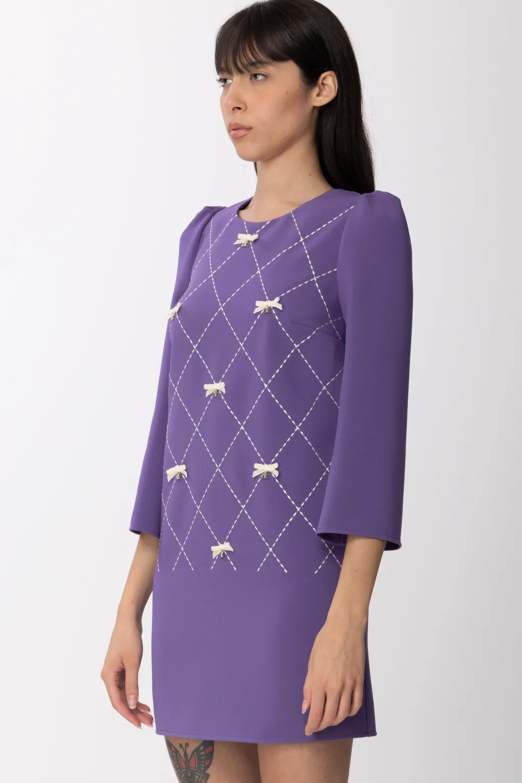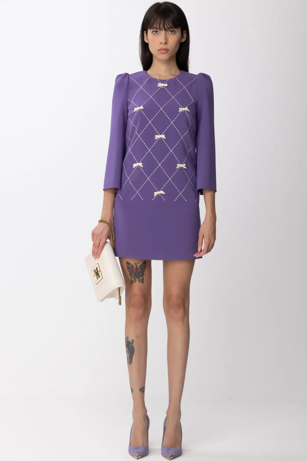 Sobrio ed elegante, l’abito Elisabtta Franchi perfetto per una serata dal mood raffinato. Design a sacchetto, con maniche a tre quarti, imprezisito da un ricamo tratteggiato di losanga con piccoli fiocchetti con ciondolo logato in oro che spiccano di luce. Decolleté ai piedi, qualche gioiello al collo e sei pronta per la tua serata!