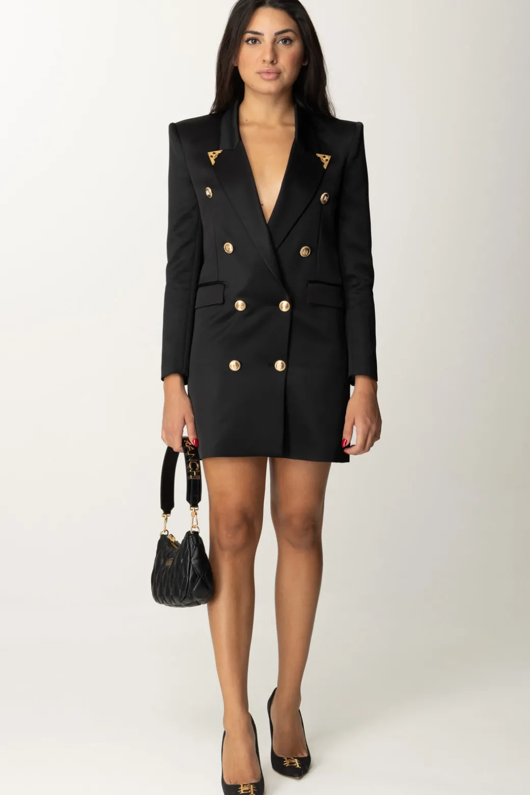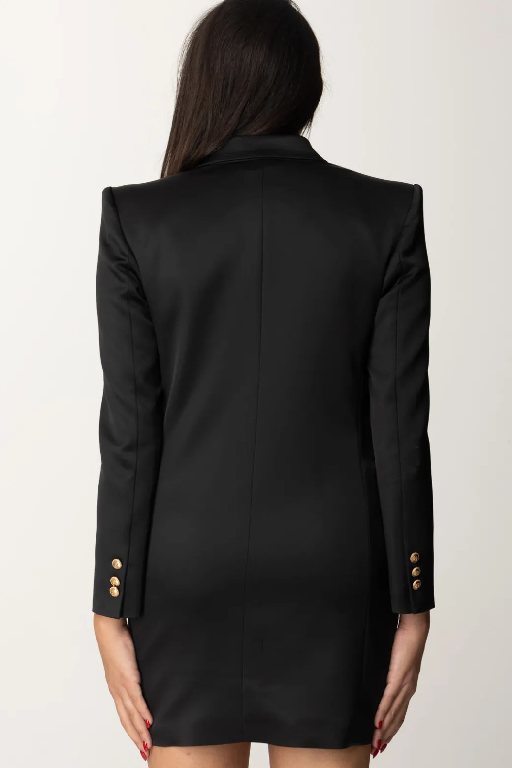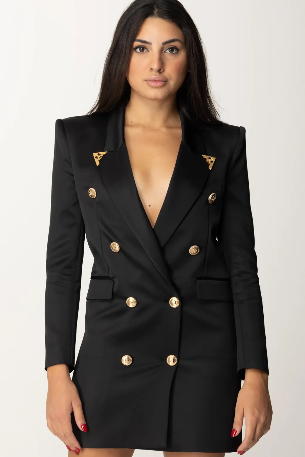 L’abito robe manteau Elisabetta Franchi realizzato in fresco lana effetto lucido, è un capo sofisticato e di tendenza, perfetto per occasioni formali. Impreziosito sui revers da puntali logati che richiamano la luce dei bottoni. Completa l’outfit con décolleté e una borsa a mano.