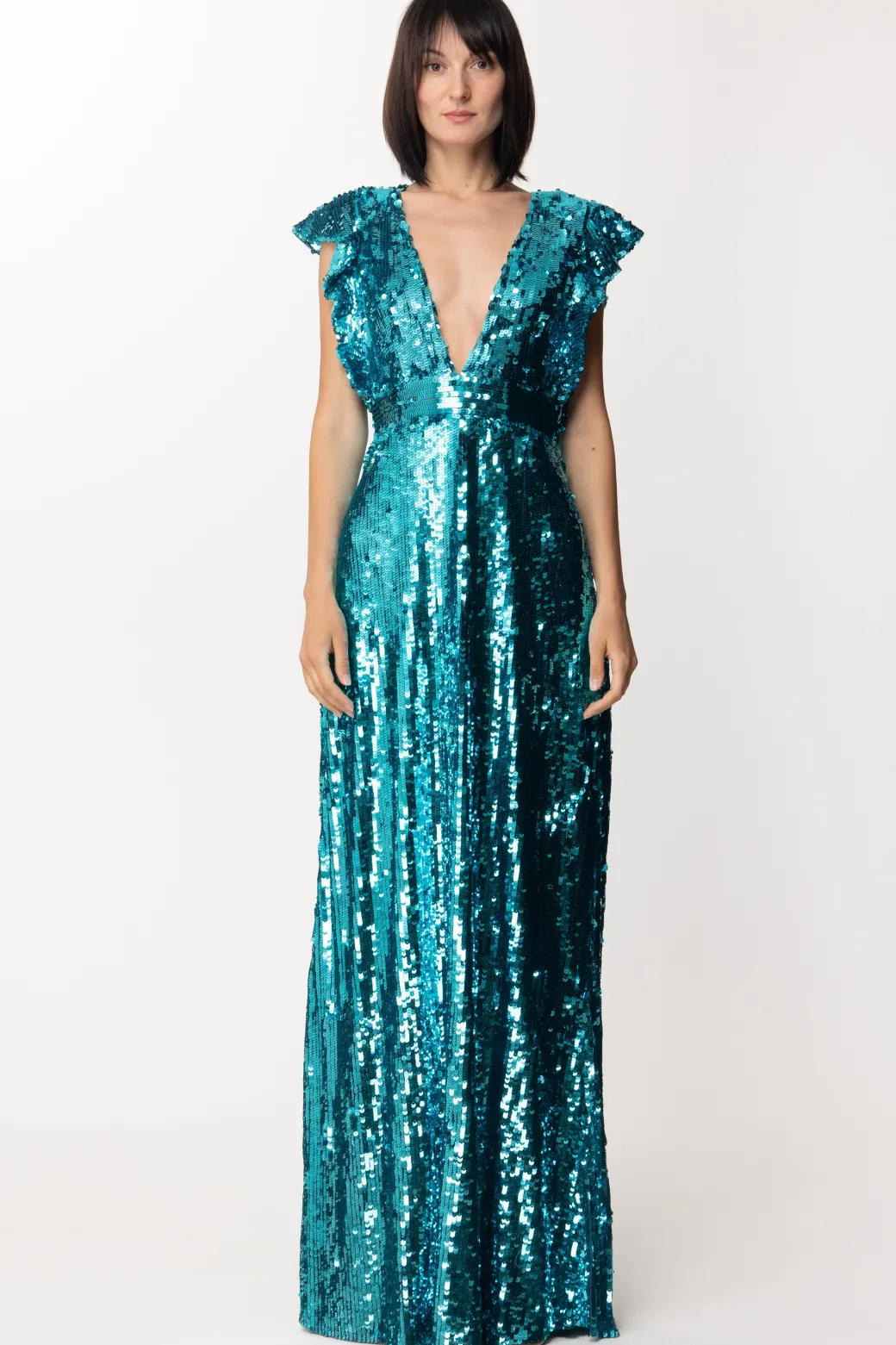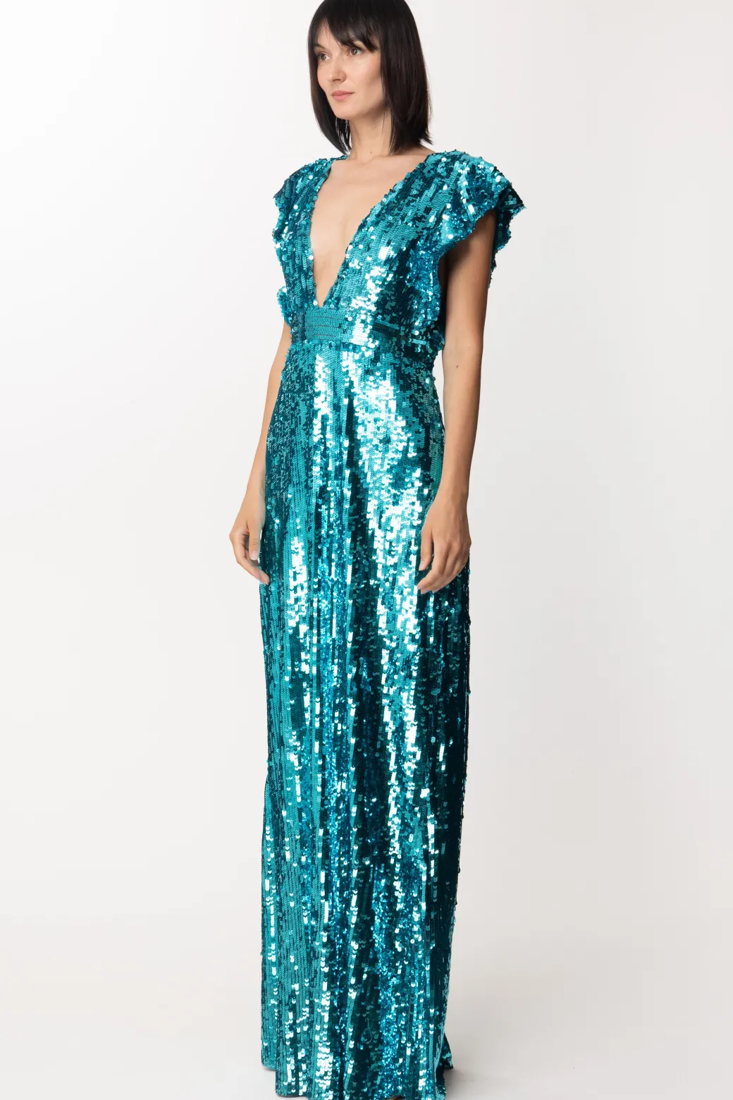 Le paillettes e gli abiti lunghi sono la combinazione perfetta per la grand soirée! Ed è proprio l’occasione in cui indossare questo abito lungo Elisabetta Franchi, dalle forme gentili e romantiche. Taglio sotto al seno, ampiamente evidenzato dallo scollo a v, e maniche appena accennate dalla presenza di volant. Sul retro, invece, un delicato scollo a goccia.