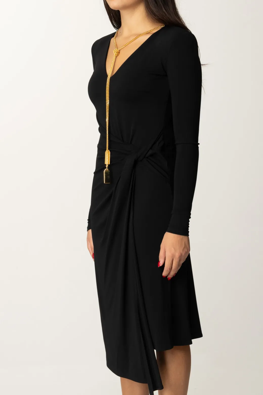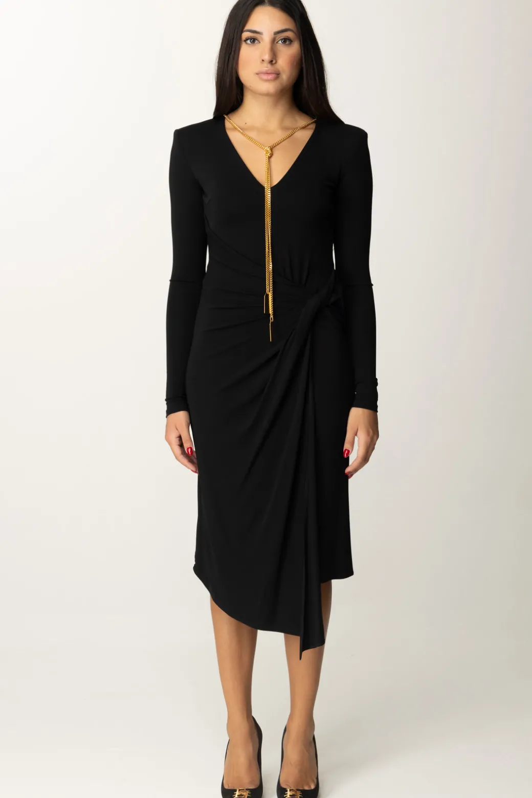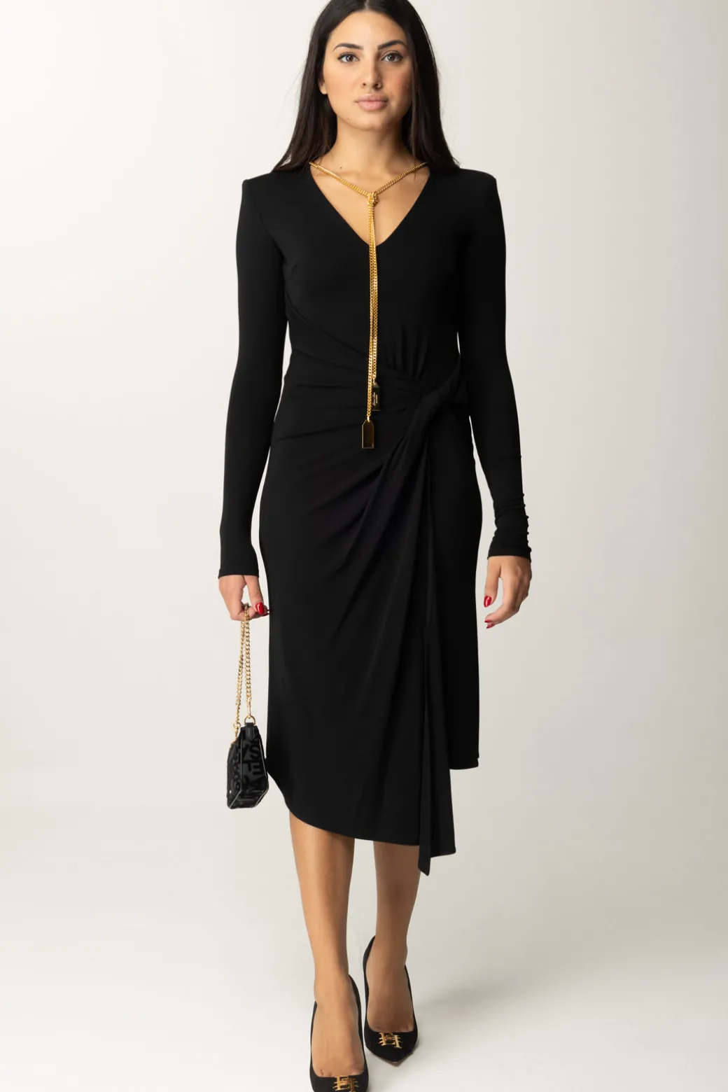 Una mise elegante e versatile, che potrai indossare from day to night con i giusti accessori. Non farti scappare questoabito Elisabetta Franchi dal taglio midi animato dall’asimmetria del fondo, data dal nodo al fianco che genera anche un morbido drappeggio sui fianchi. Scollatura profonda, è completato dalla presenza di un accessorio a collana tipico della collezione, in oro, con pendenti logati, che potrai rimuovere all’occorrenza per rendere il tuo look più sobrio o aggiungere il bijoux che preferisci.