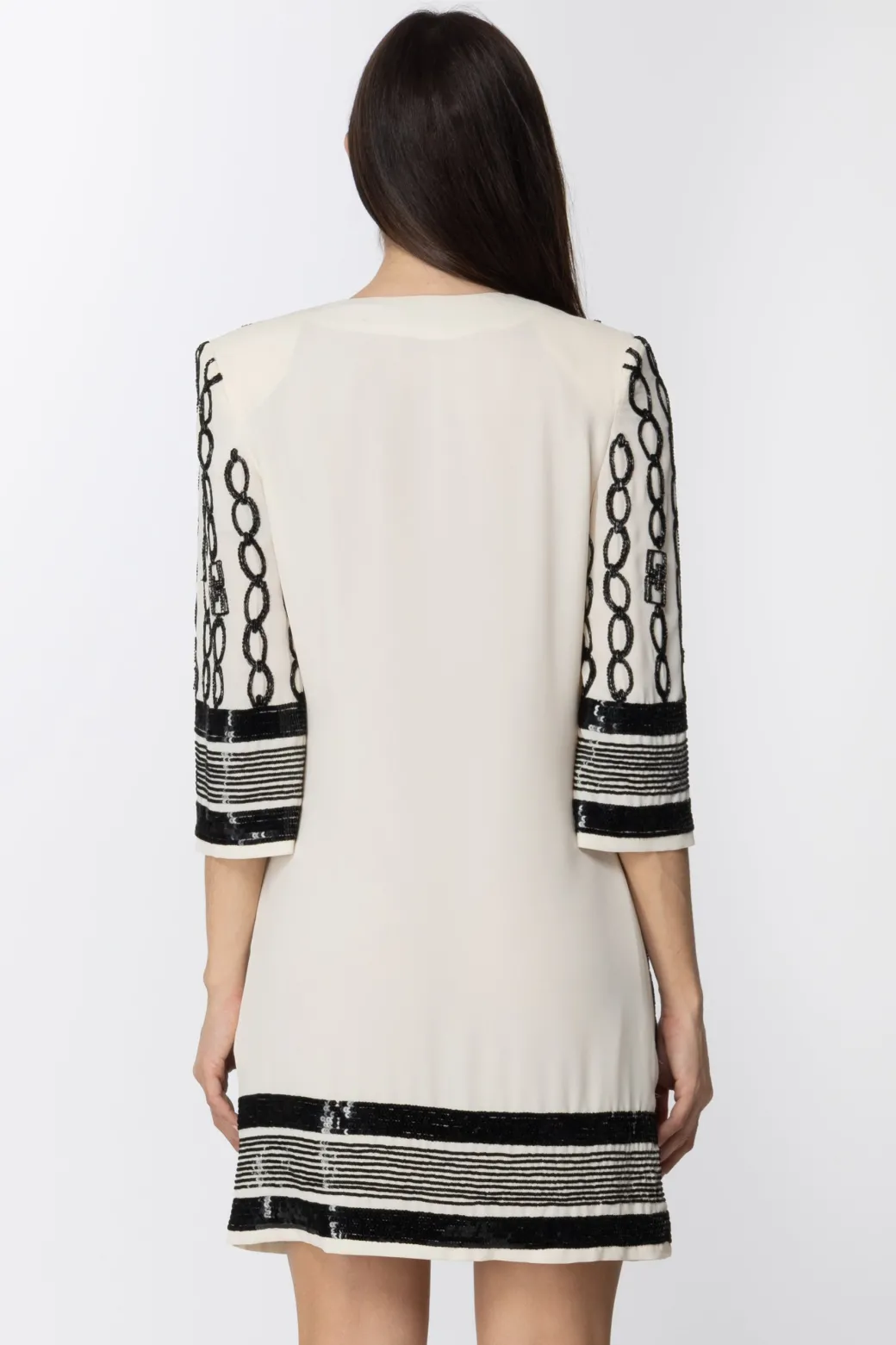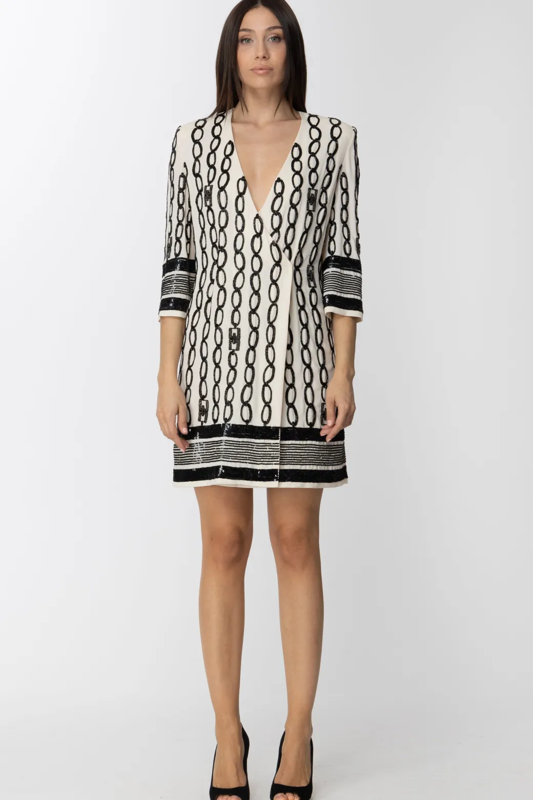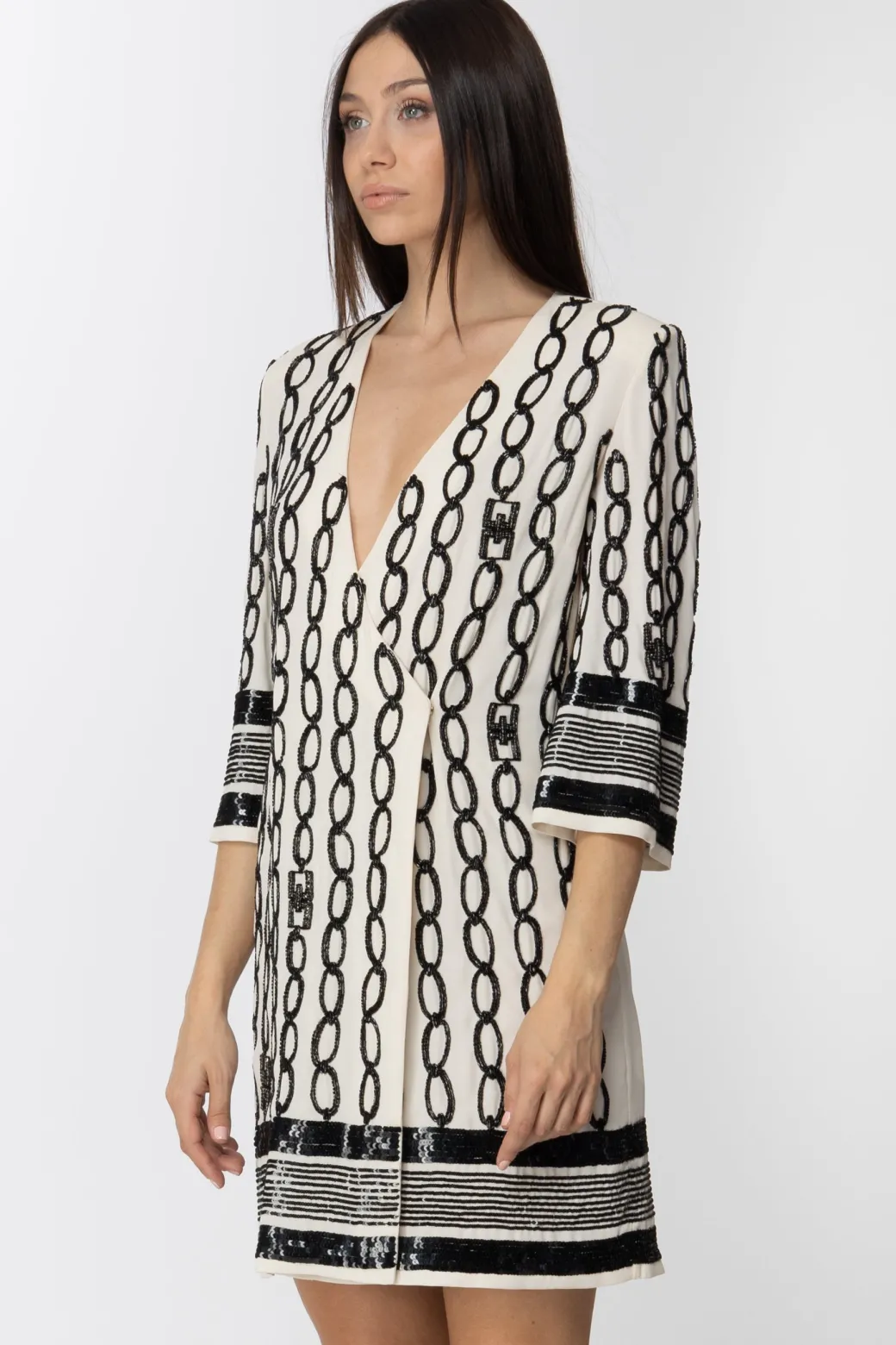 Un’allure così chic che non potrai farne a meno per il tuo prossimo evento: una raffinatezza mai esagerata, sempre elegante, quella di questo abito ricamato Elisabetta Franchi. Chiusura a portafogli supportata da un cordoncino al punto vita, ampie maniche a tre quarti, ricamo catene che richiama il mood della collezione: sarai perfetta con una pochette e un paio di decolletes.