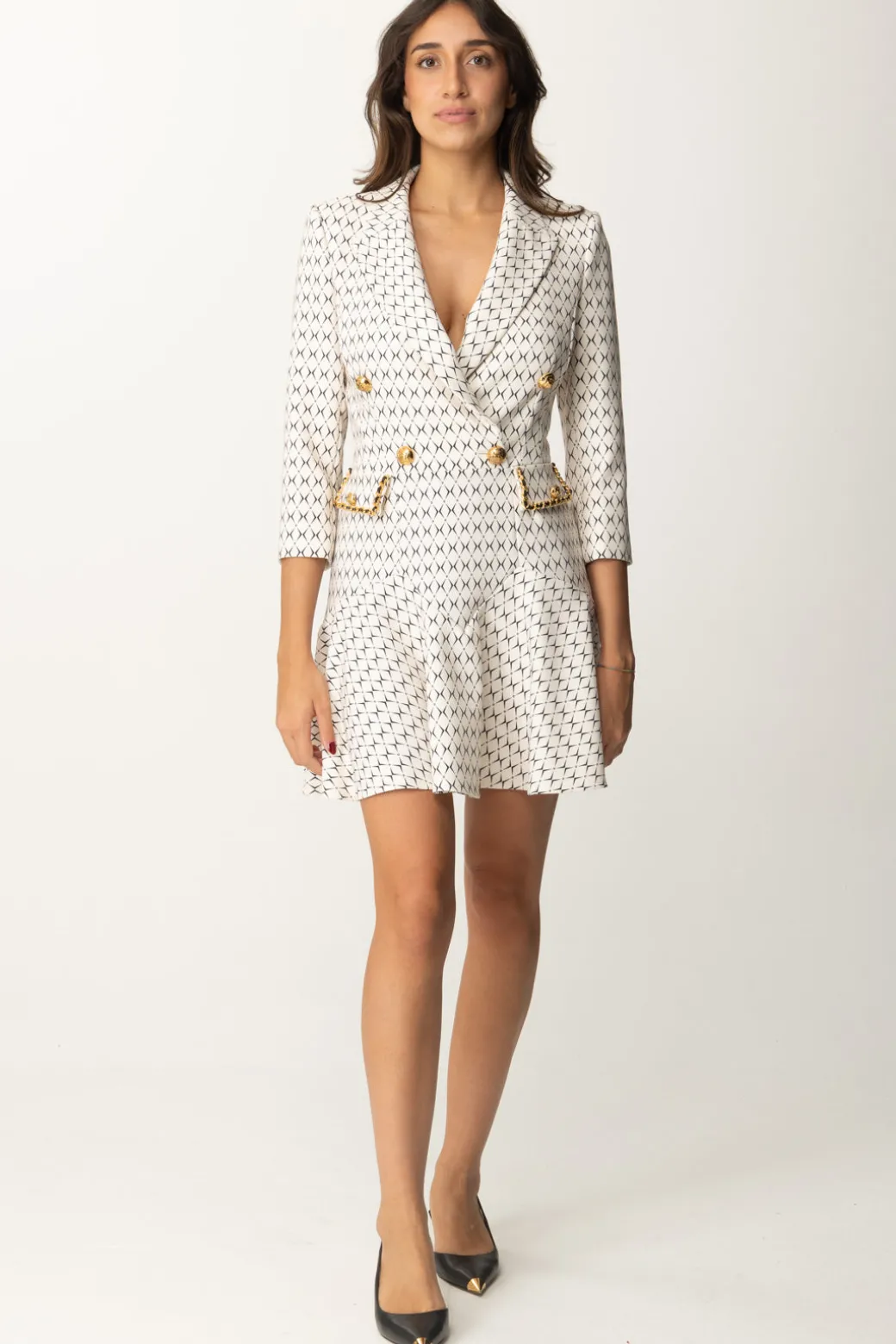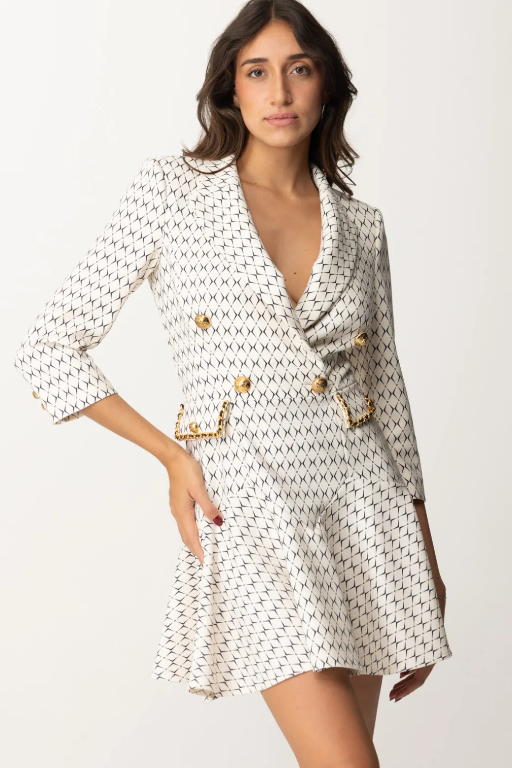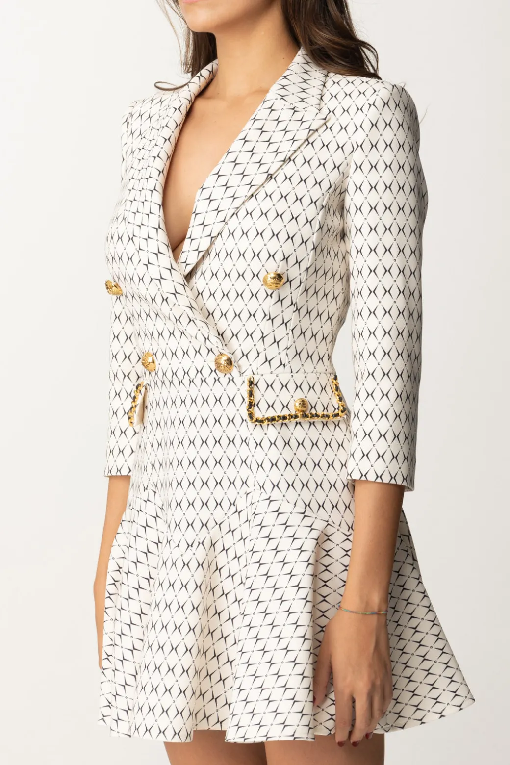 Un robe manteau in linea di cui non farai fatica a riconoscere stile e brand: a partire dalla tipica stampa rombi, questo mini abito Elisabetta Franchi è un rappresentante ideale della maison! Silhouette perfetta data dal punto vita aderente e illuminato da dettagli a catena gold, con la gonna corta svasata che fa paio con il top a giacca con revers a lancia, un capo equilibrato ed elegnate che è un’ode alla femminilità: la tua!