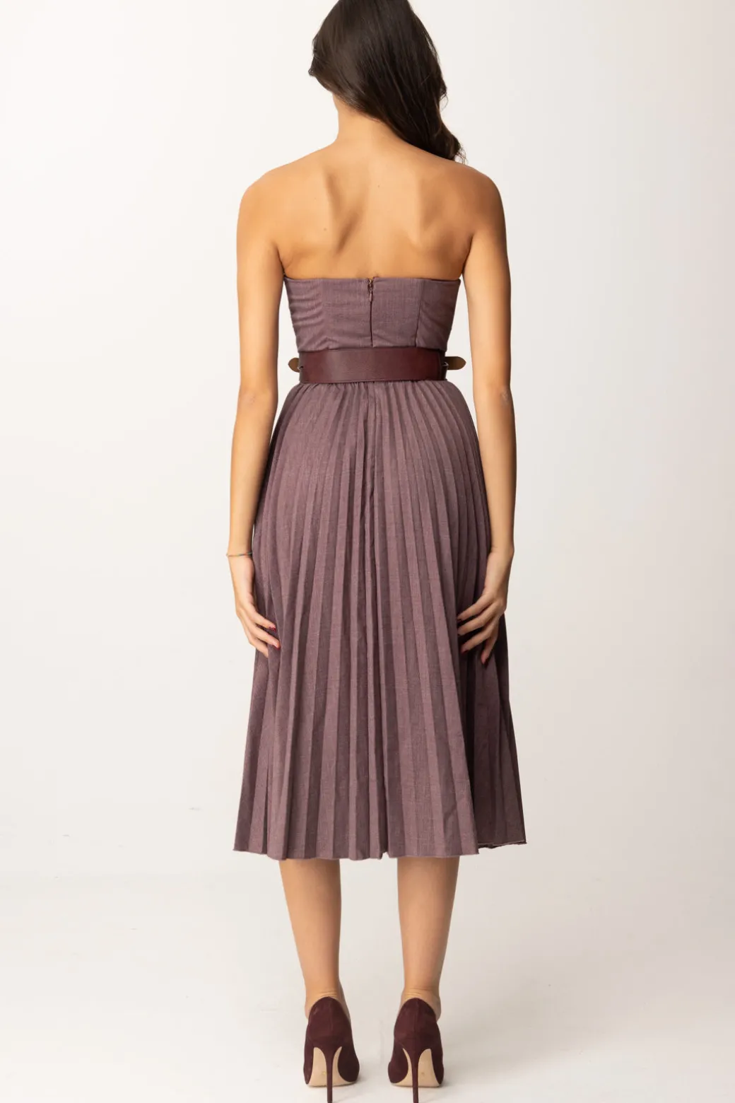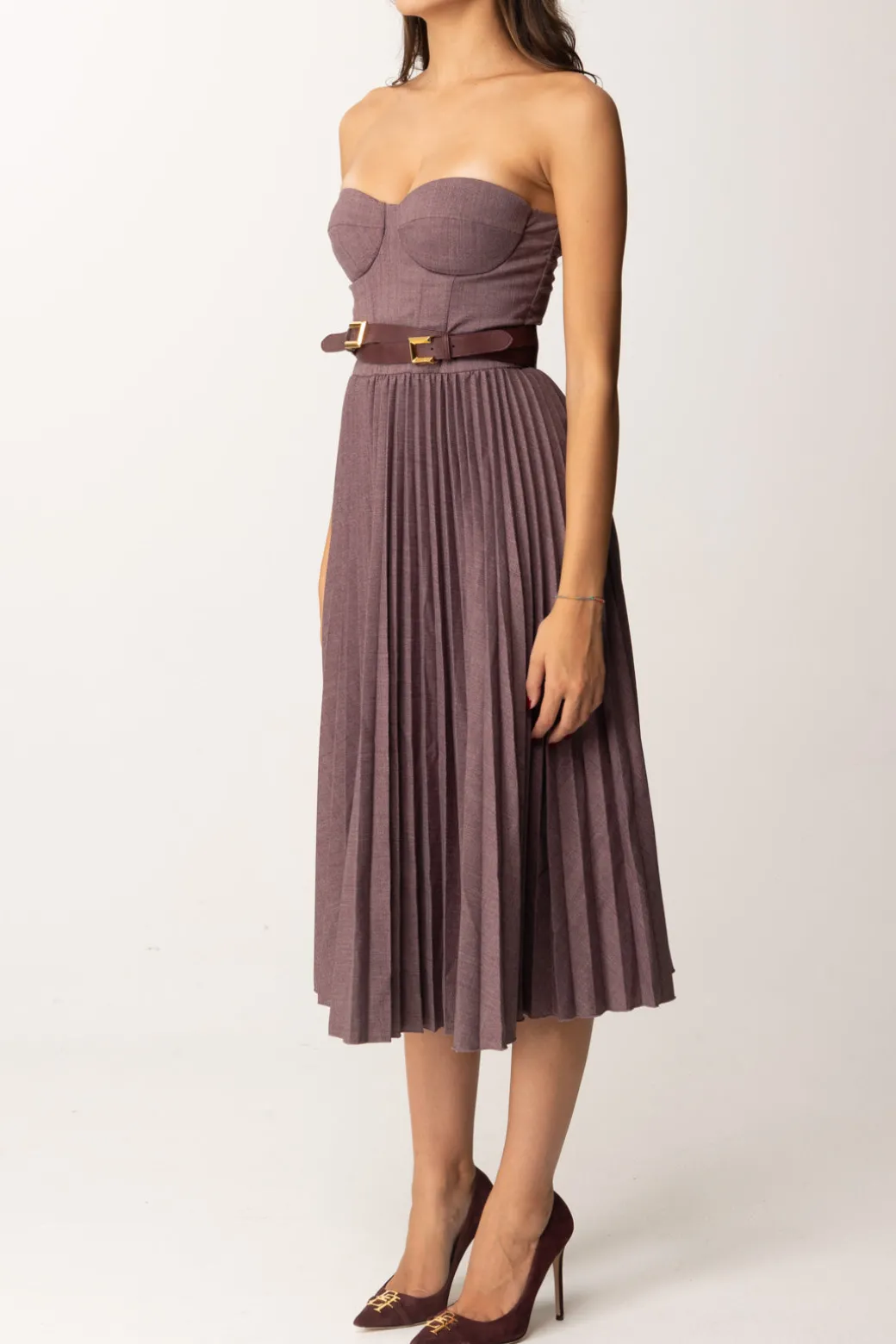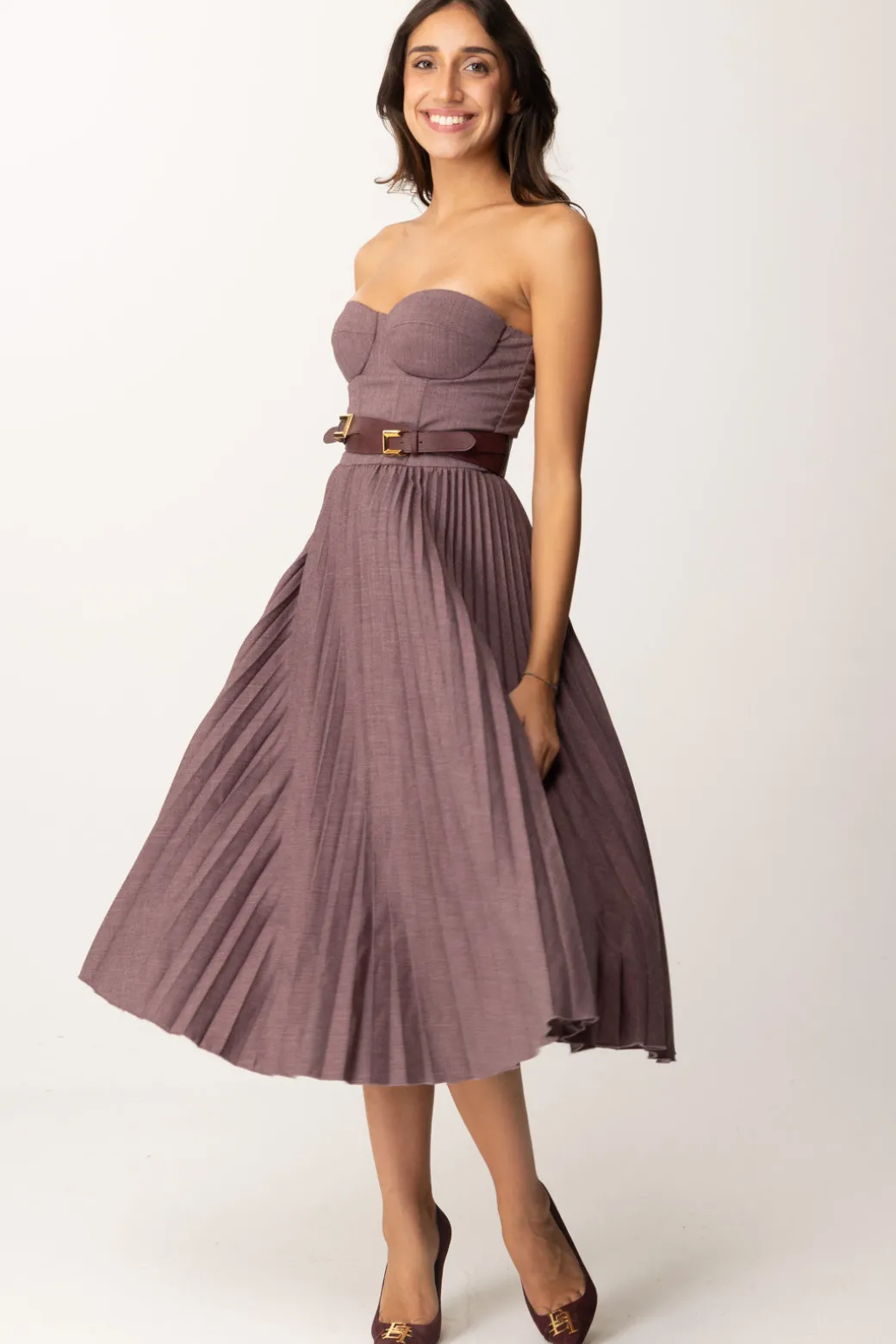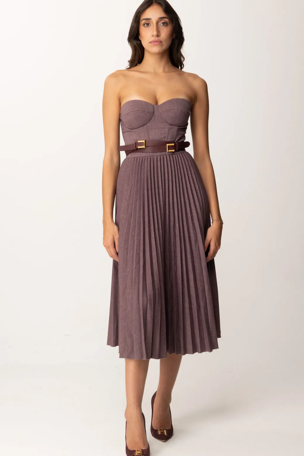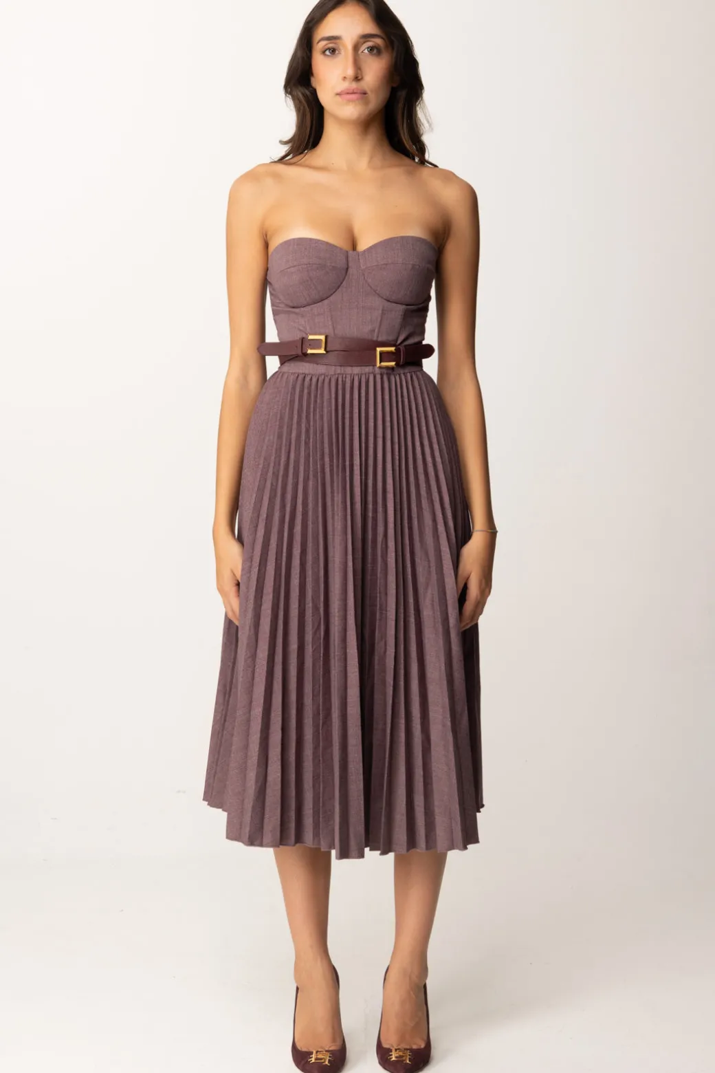 Romatica mise per romantiche anime: questoabito midi Elisabetta Franchi è pensato proprio per voi! Scollatura a scollo cuore nel top a corpetto, combinato con una gonna longuette ampia e plissettata, un risultato femminile e un po’ retrò completato da una cintura con doppia fibbia che avvolge il punto vita – ma che puoi rimuovere e sostituire come vuoi per personalizzare il tuo look. Classico con delle decolletes, audace con degli stivali, bellissimo sempre.
