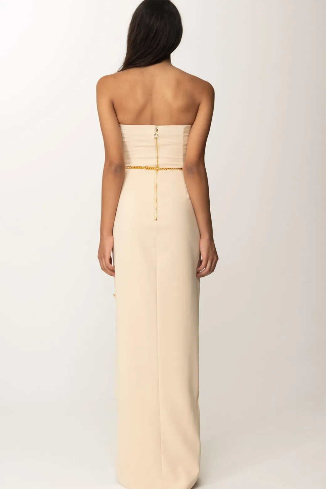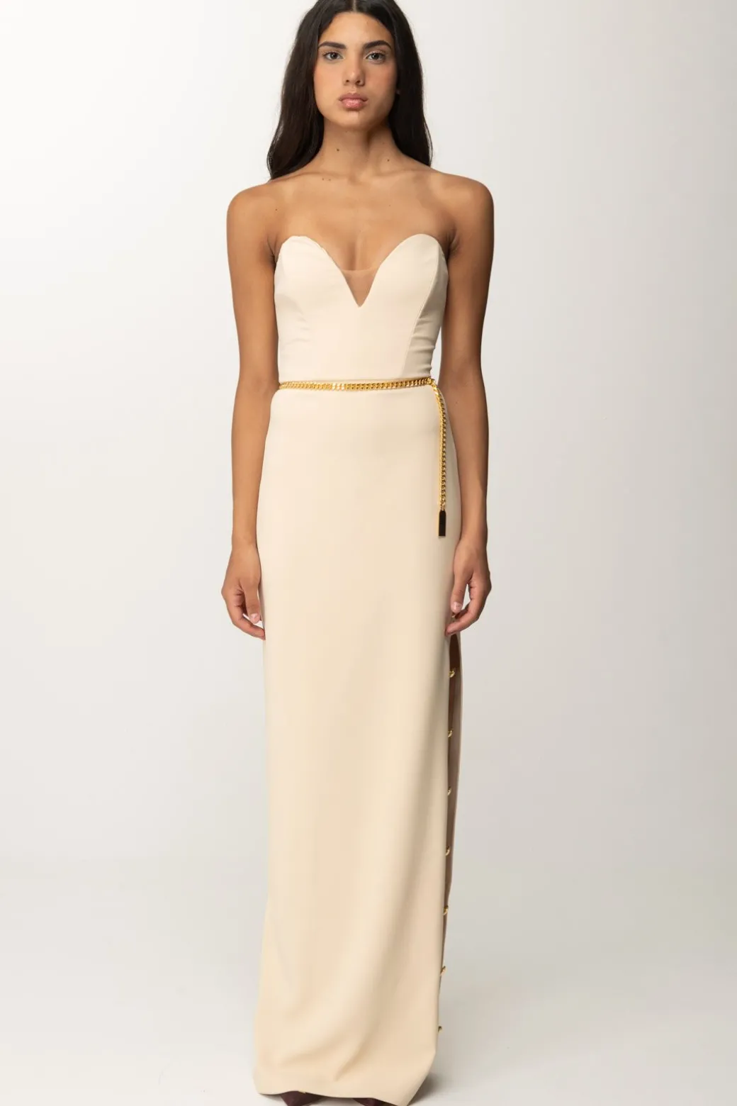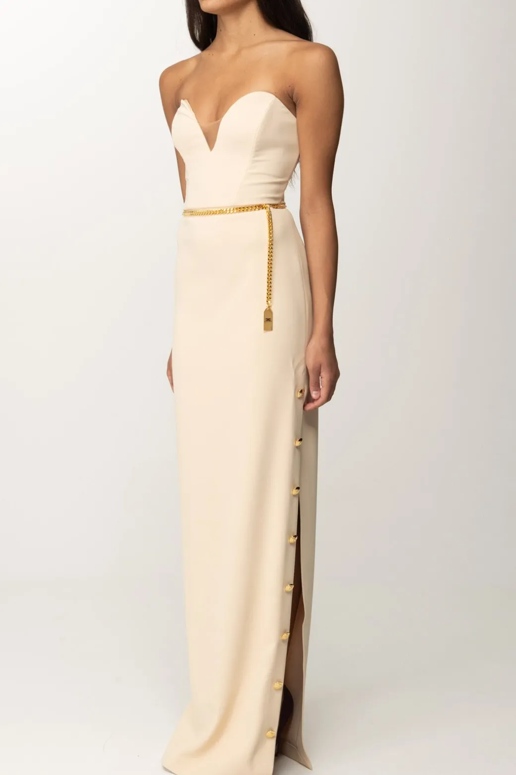 Scollo cuore e spacco laterale vertiginoso ornato da bottoni dorati per questo abito Elisabetta Franchi della linea Red Carpet. Una mise semplice e romantica, sagomata sulla silhouette per esaltarla, grazie anche alla presenza della cintura a catena al punto vita che crea un ulteriore focus sulle tue curve: tacchi alti e make up minimal per incantare con essenzialità ed eleganza.