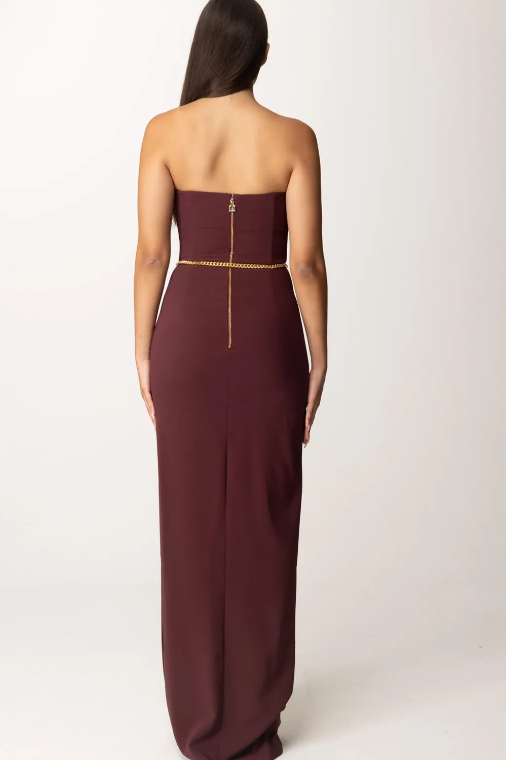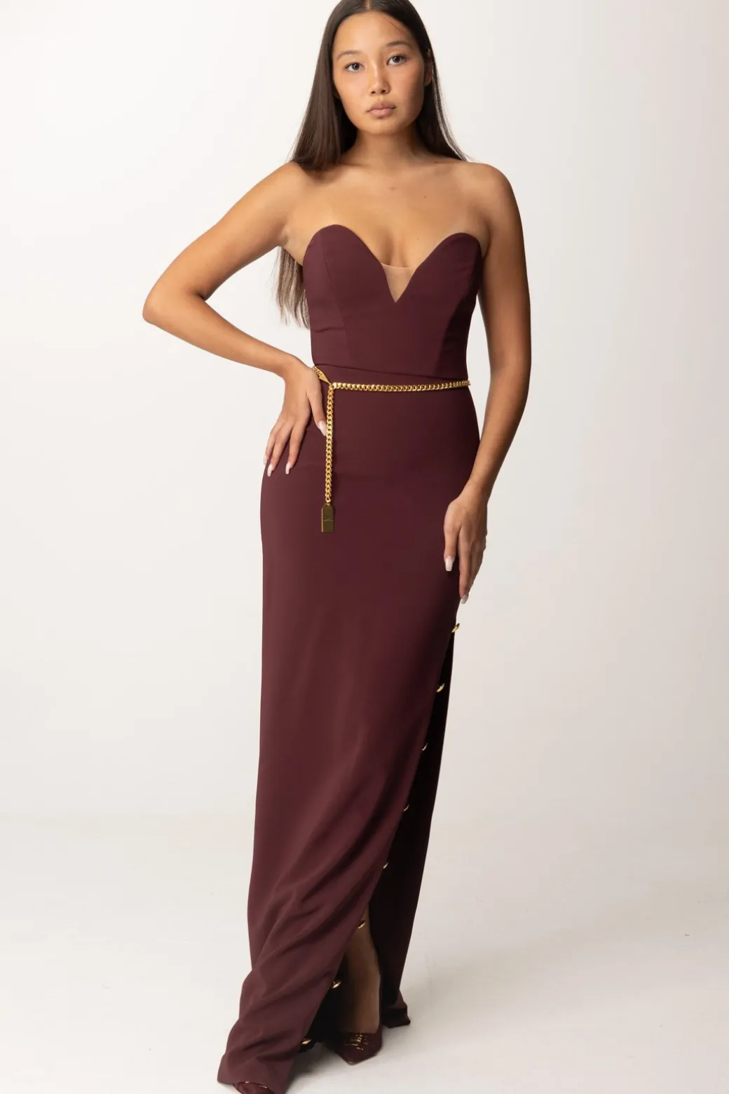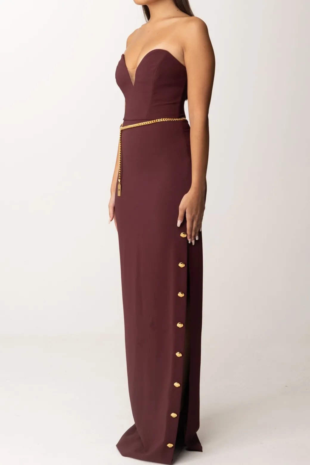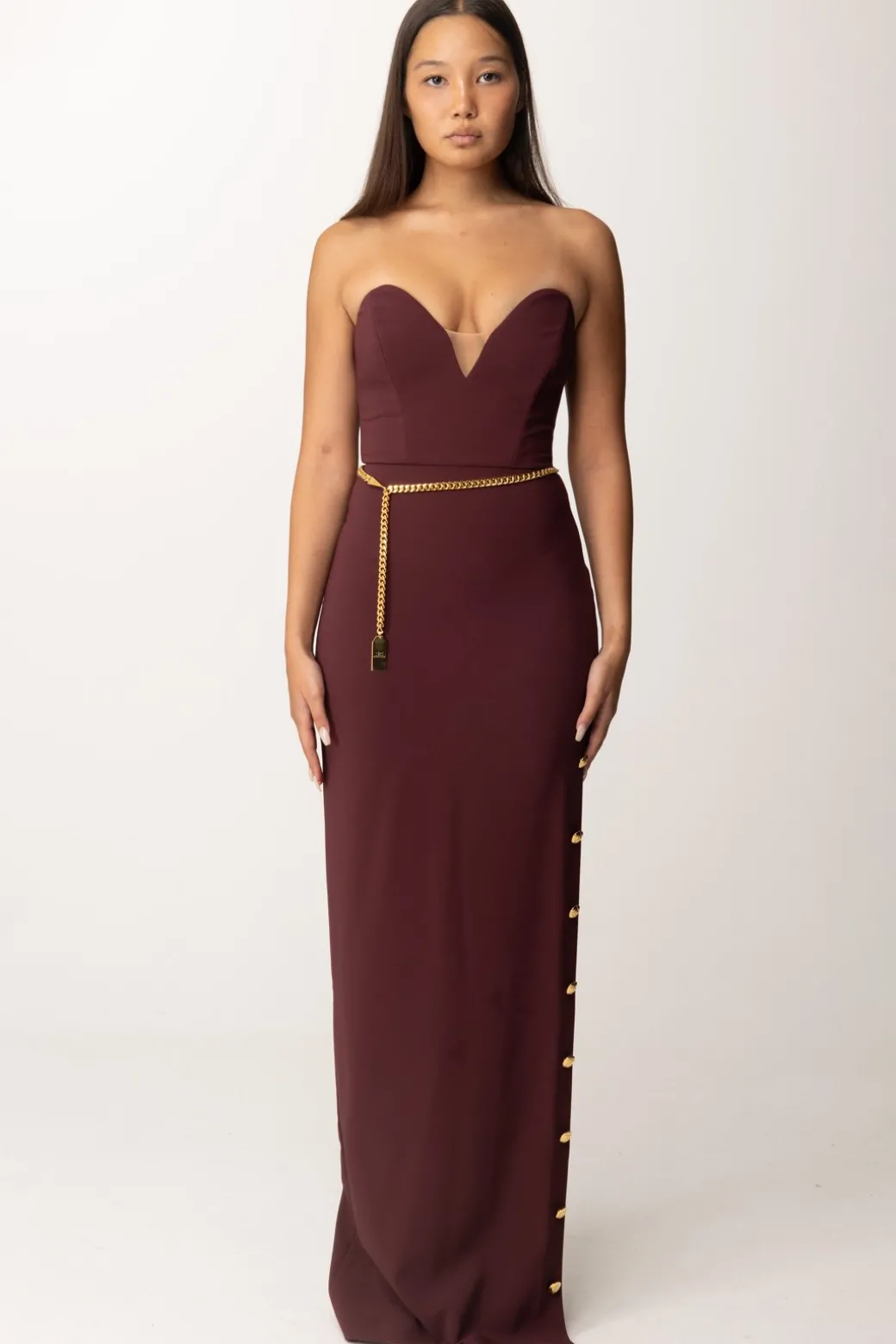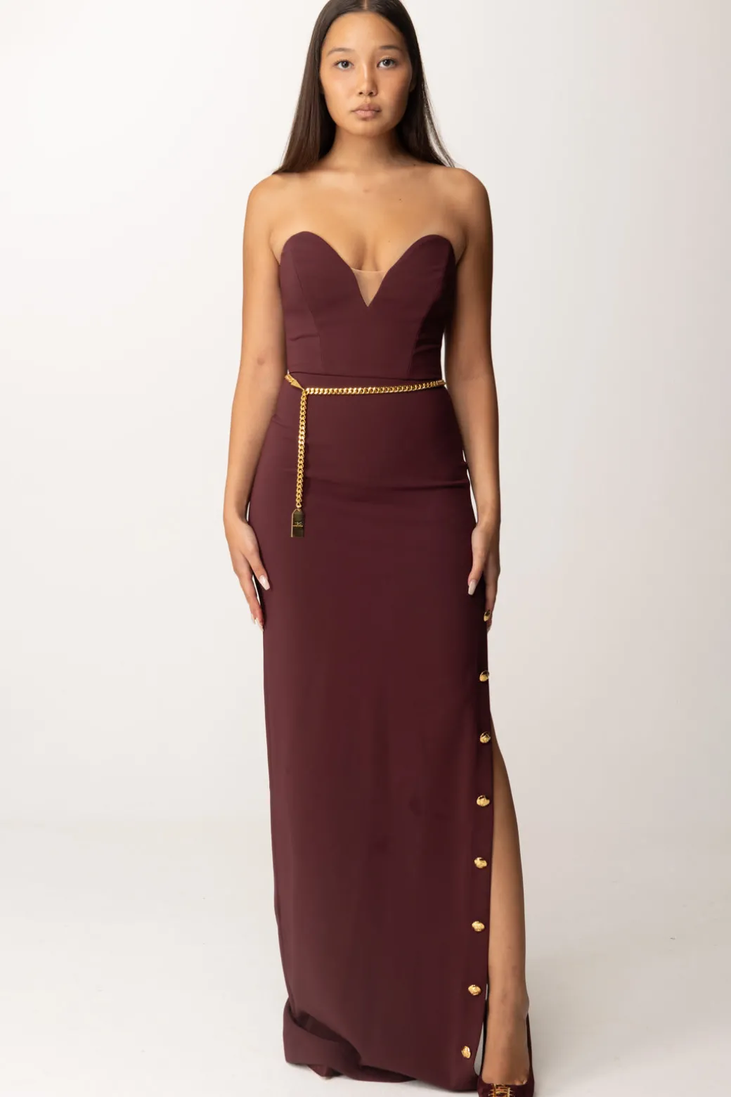 Scollo cuore e spacco laterale vertiginoso ornato da bottoni dorati per questo abito Elisabetta Franchi della linea Red Carpet. Una mise semplice e romantica, sagomata sulla silhouette per esaltarla, grazie anche alla presenza della cintura a catena al punto vita che crea un ulteriore focus sulle tue curve: tacchi alti e make up minimal per incantare con essenzialità ed eleganza.