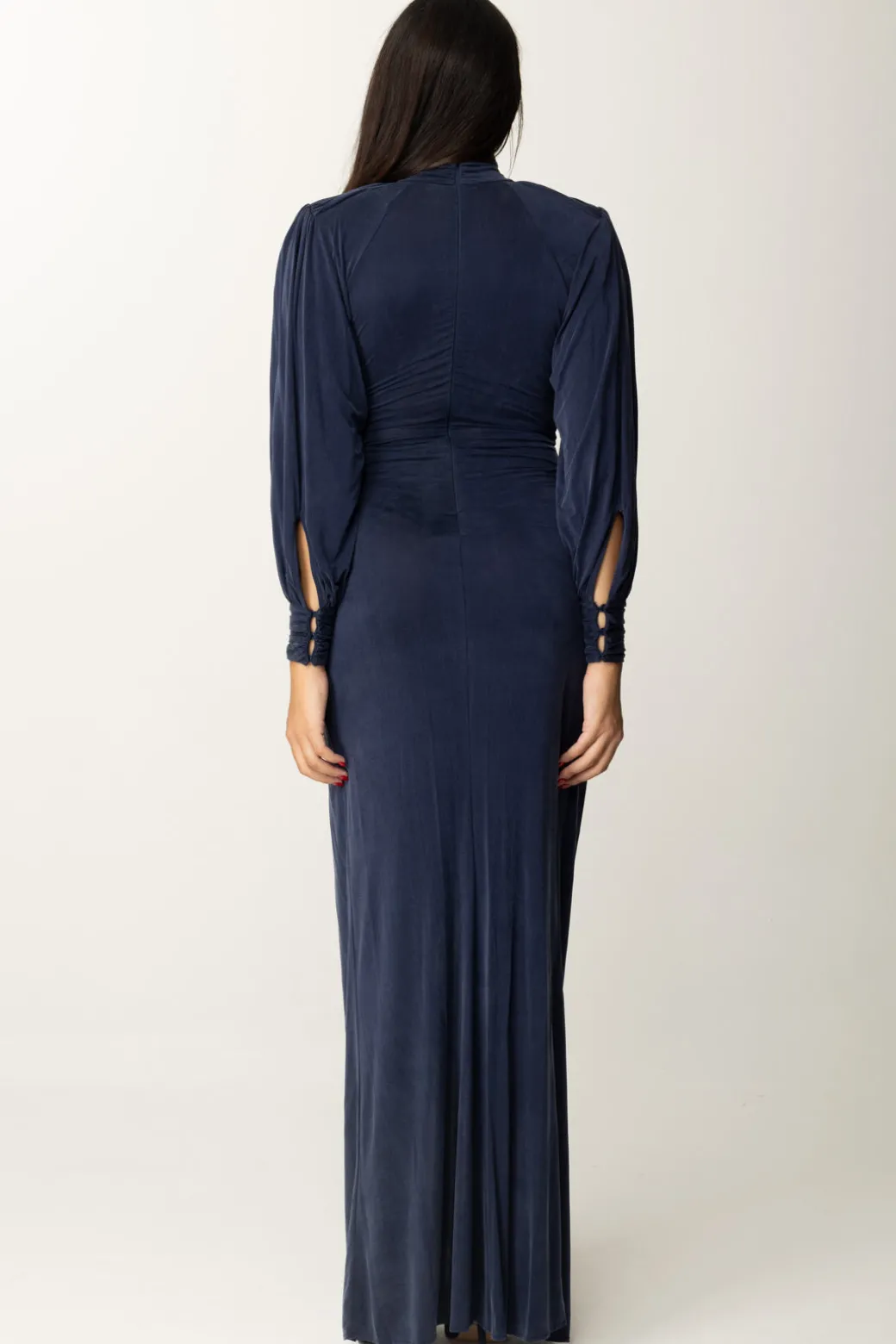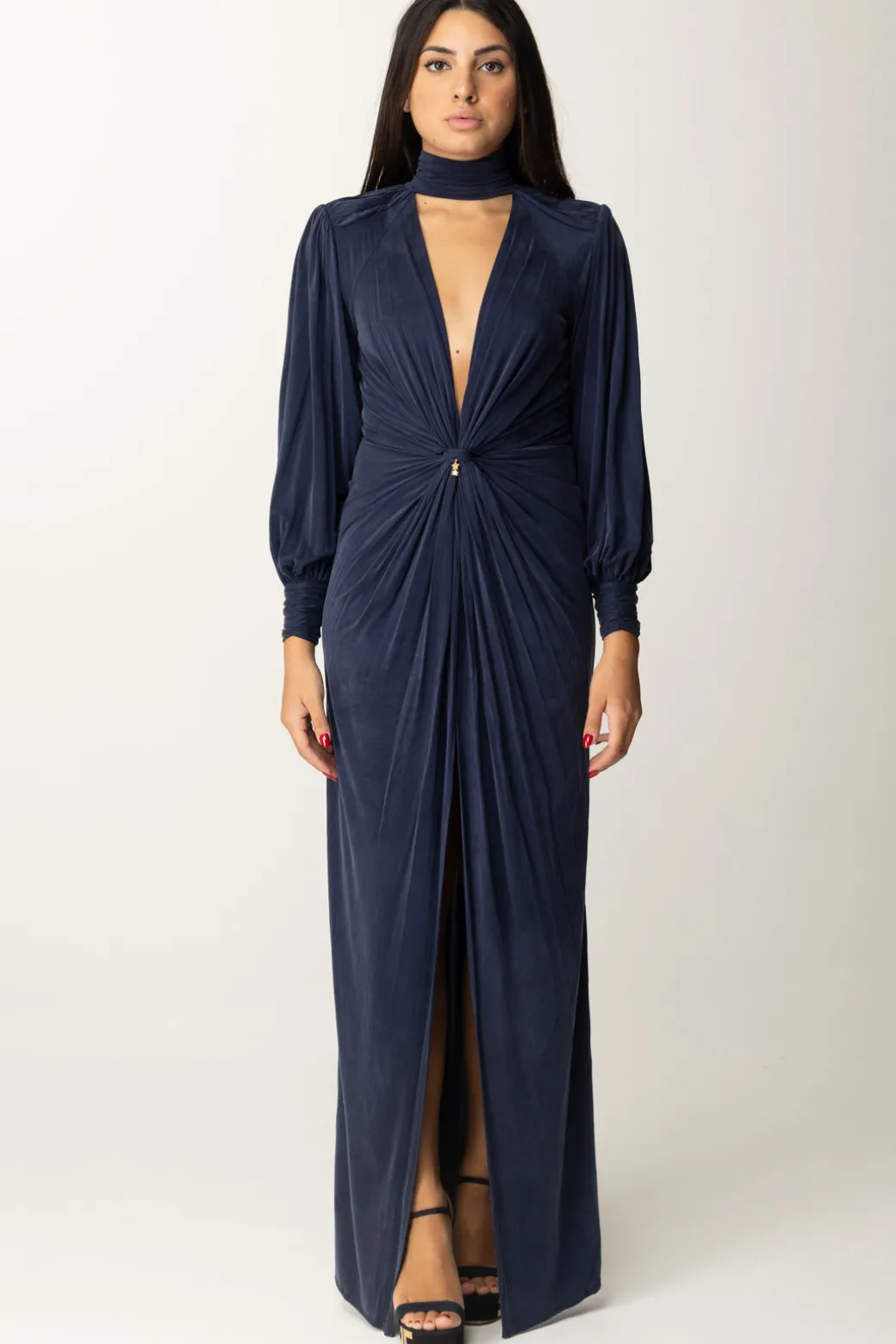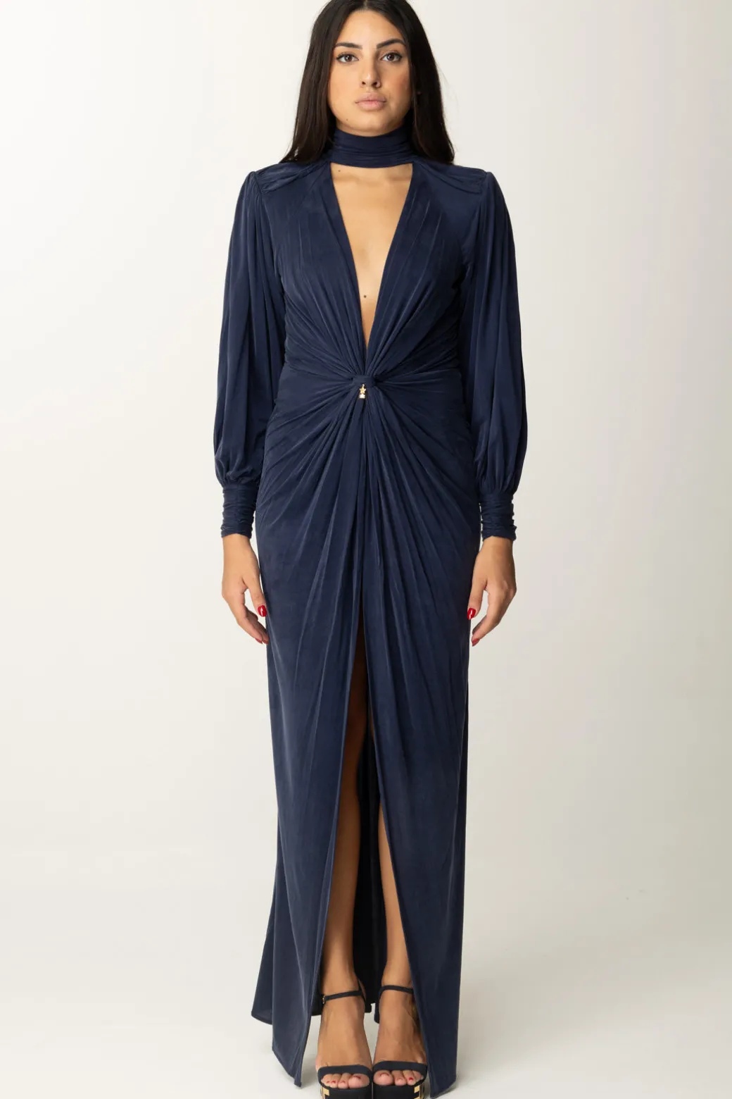 Questo elegante abito Red Carpet Elisabetta Franchi esalta la figura grazie al suo design che presenta un collo alto, maniche ampie e arricciate e una profonda scollatura con nodo centrale che crea un effetto drappeggio scultoreo. Abbinato a sandali e una pochette brillante avrai il perfettolook da evento speciale.