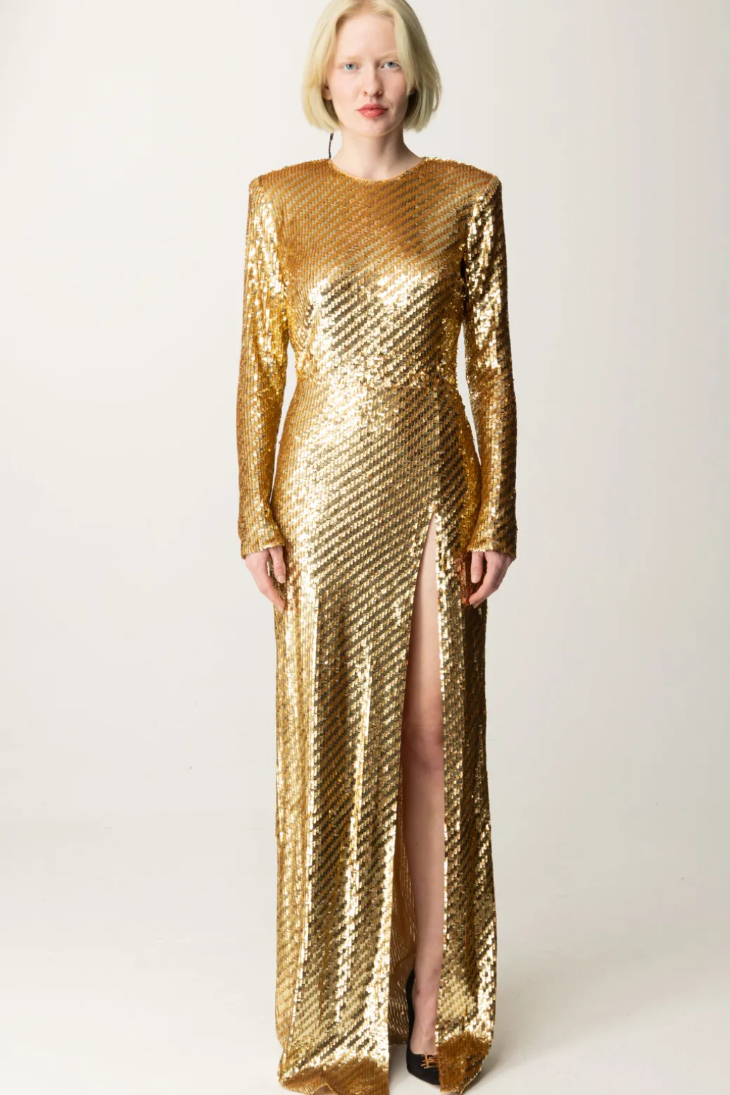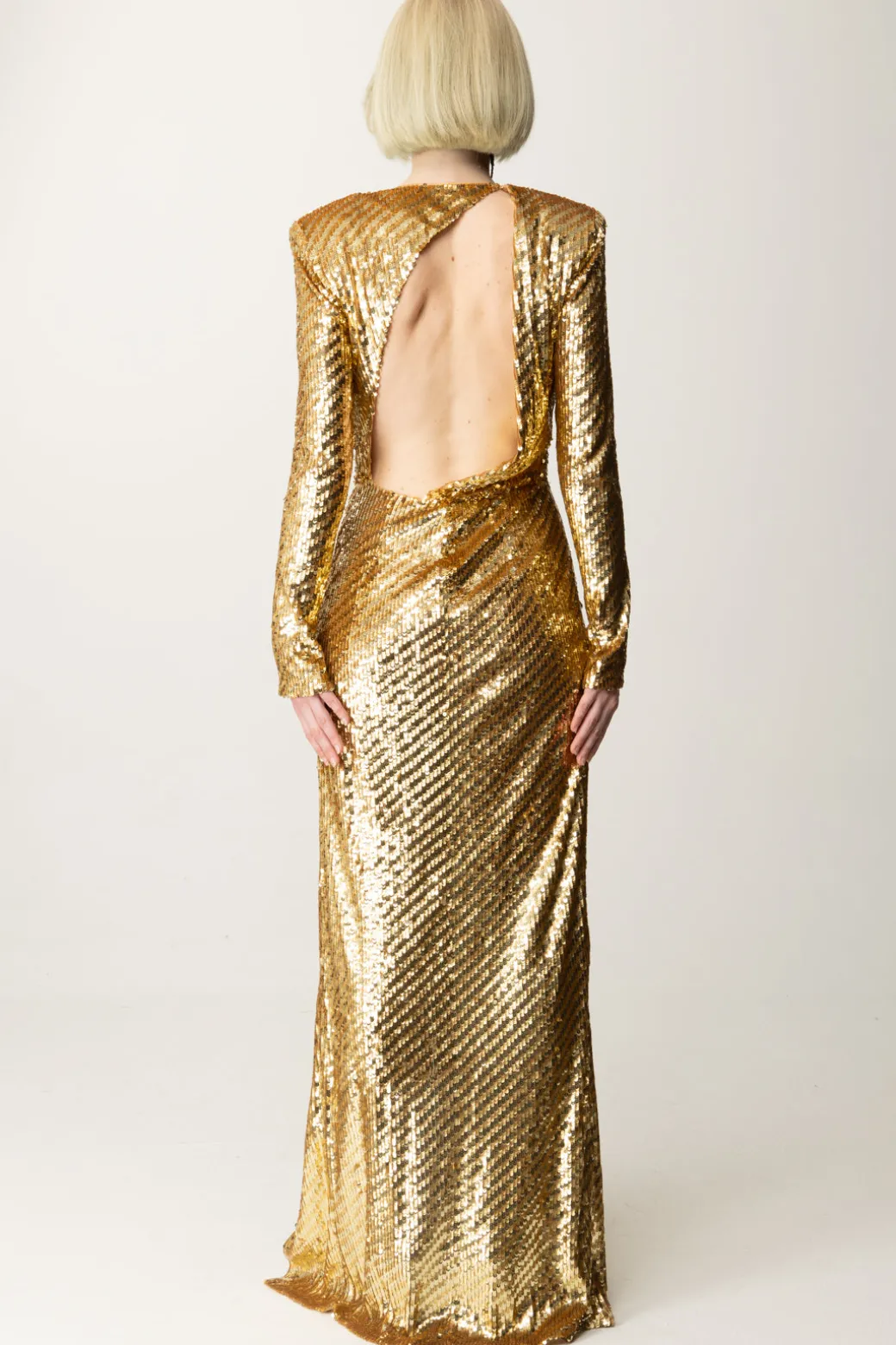 Un Abito red carpet Elisabetta Franchi dal mood abbagliante, realizzato in tulle interamente ricamato a mano con paillettes, caratterizzato da un profond spacco laterale e cut-out asimmetrico sulla schiena. Le spalle strutturate creano un’affermazione audace ma elegante, mentre la silhouette aderente enfatizza la raffinatezza. Ideale per eventi sul red carpet o occasioni eleganti.