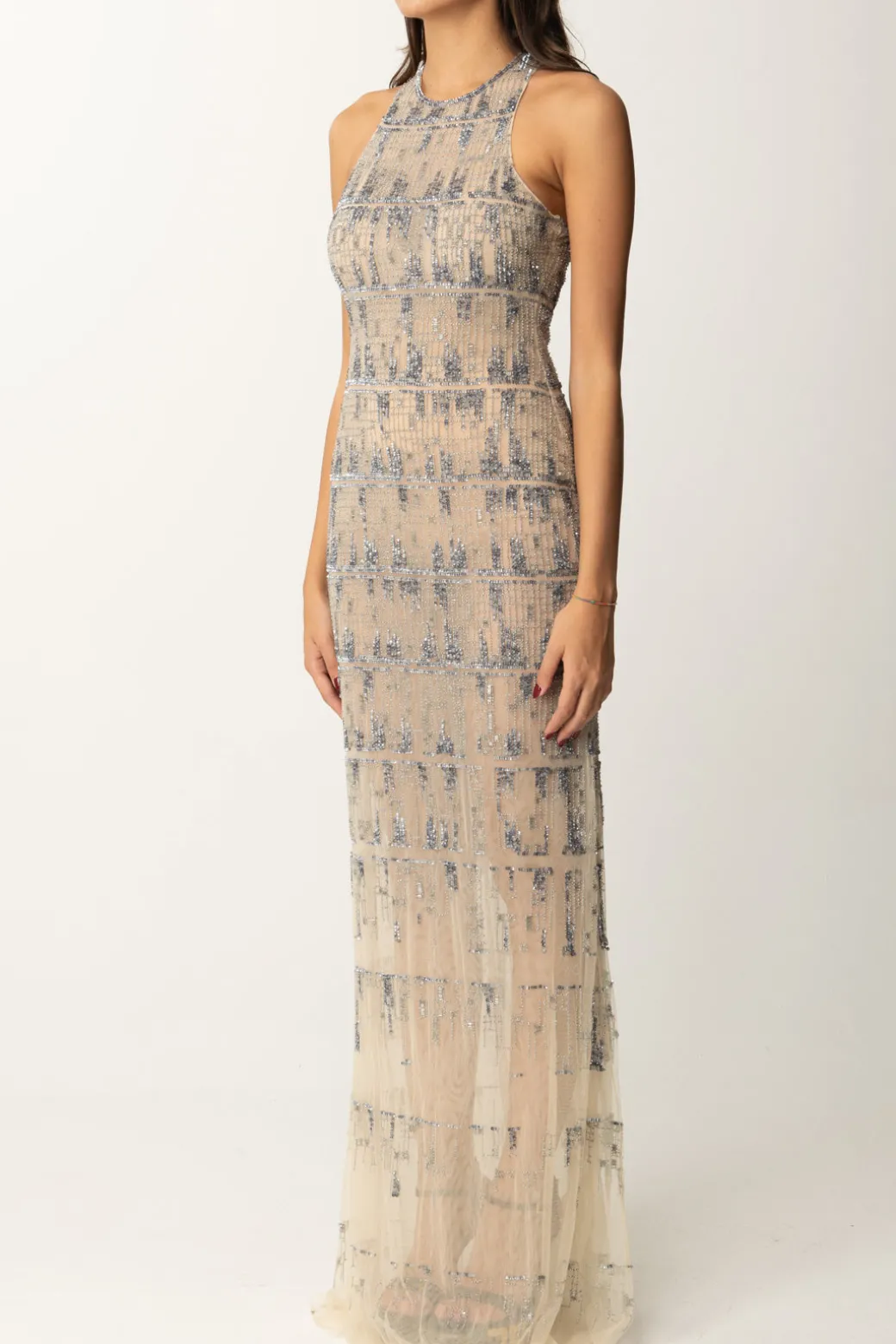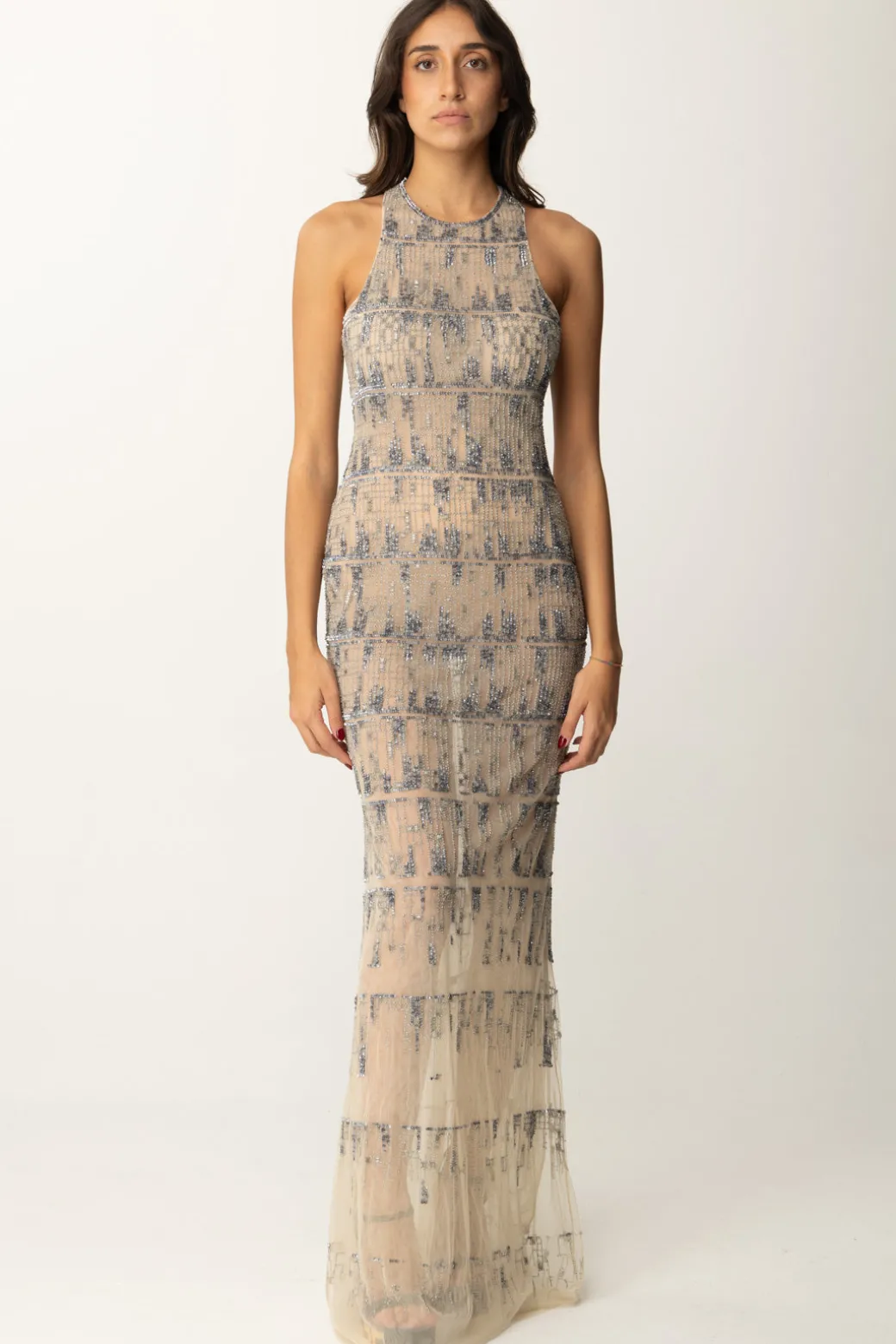Abito Elisabetta Franchi della linea Red Carpet per lasciare tutti a bocca aperta: non solo per il gioco di vedo-non vedo dato dal tulle, ma anche per l’elaborato ricamo realizzato a mano che ricrea un effetto pixel lungo tutta la silhouette. Appariscente ma non modo raffinato, con scollo all’americana che valorizza le spalle e gonna svasata al fondo per riequilibrare il design, un pezzo unico da riservare alle tue passerelle più importanti.