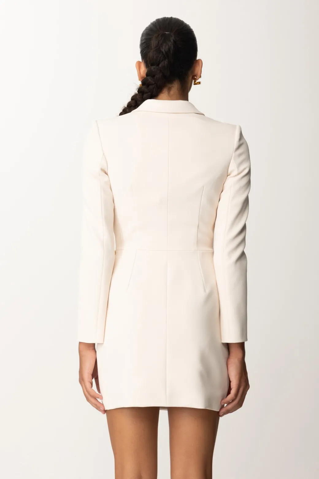 Raffinato abito-manteau Elisabetta Franchi con revers a lancia e maniche lunghe, realizzato in crêpe stretch. Il punto vita è definito da una luminosa cintura con catena e charms dorati. Perfetto con sandali o decolleté abbinato a una clutch elegante.