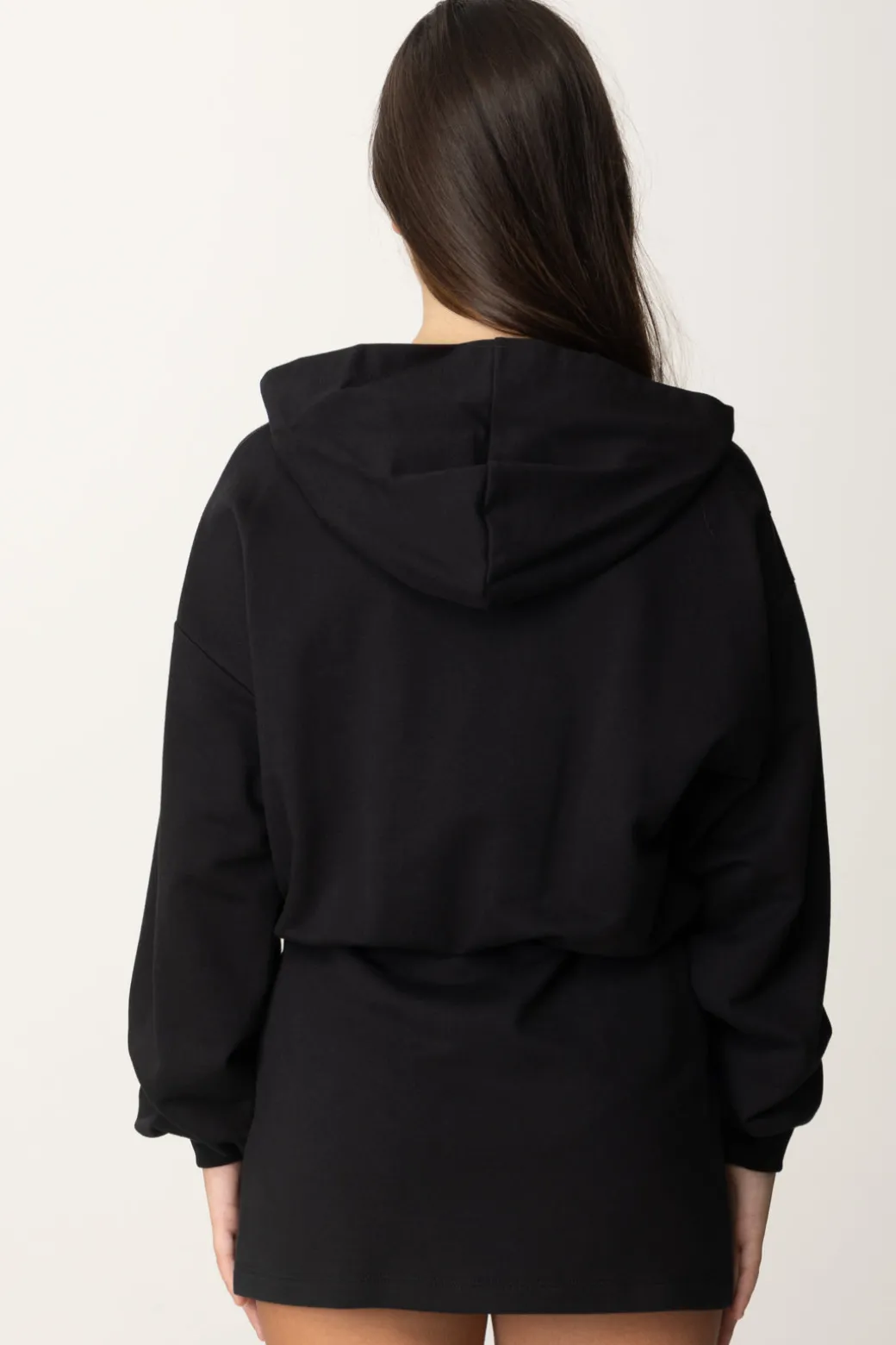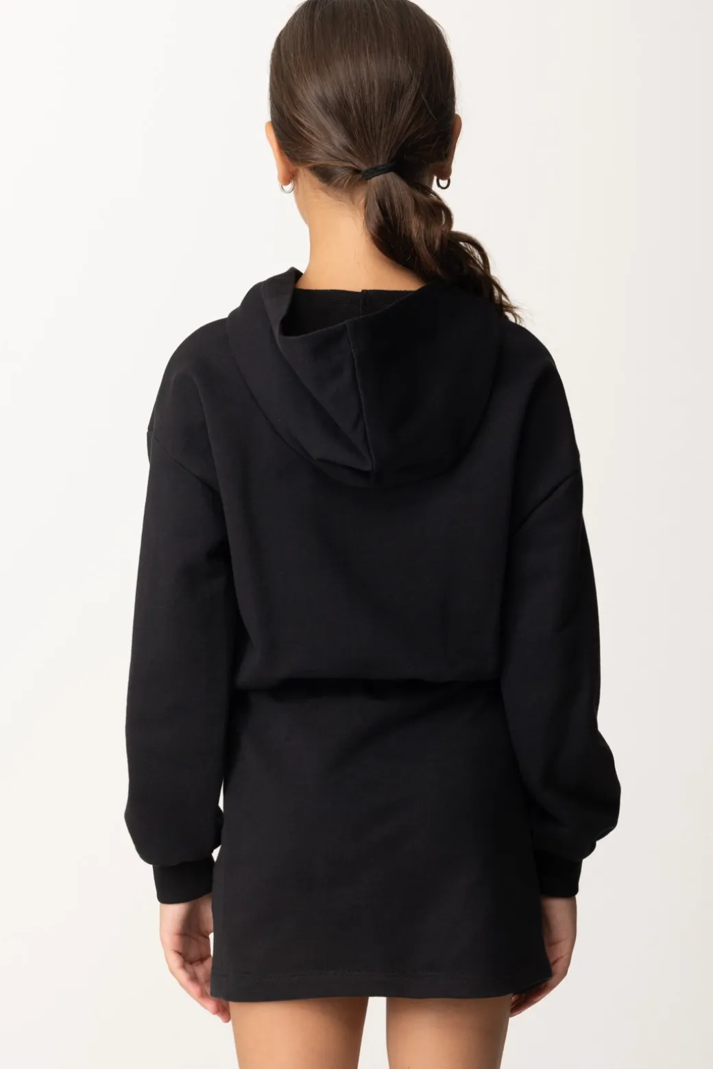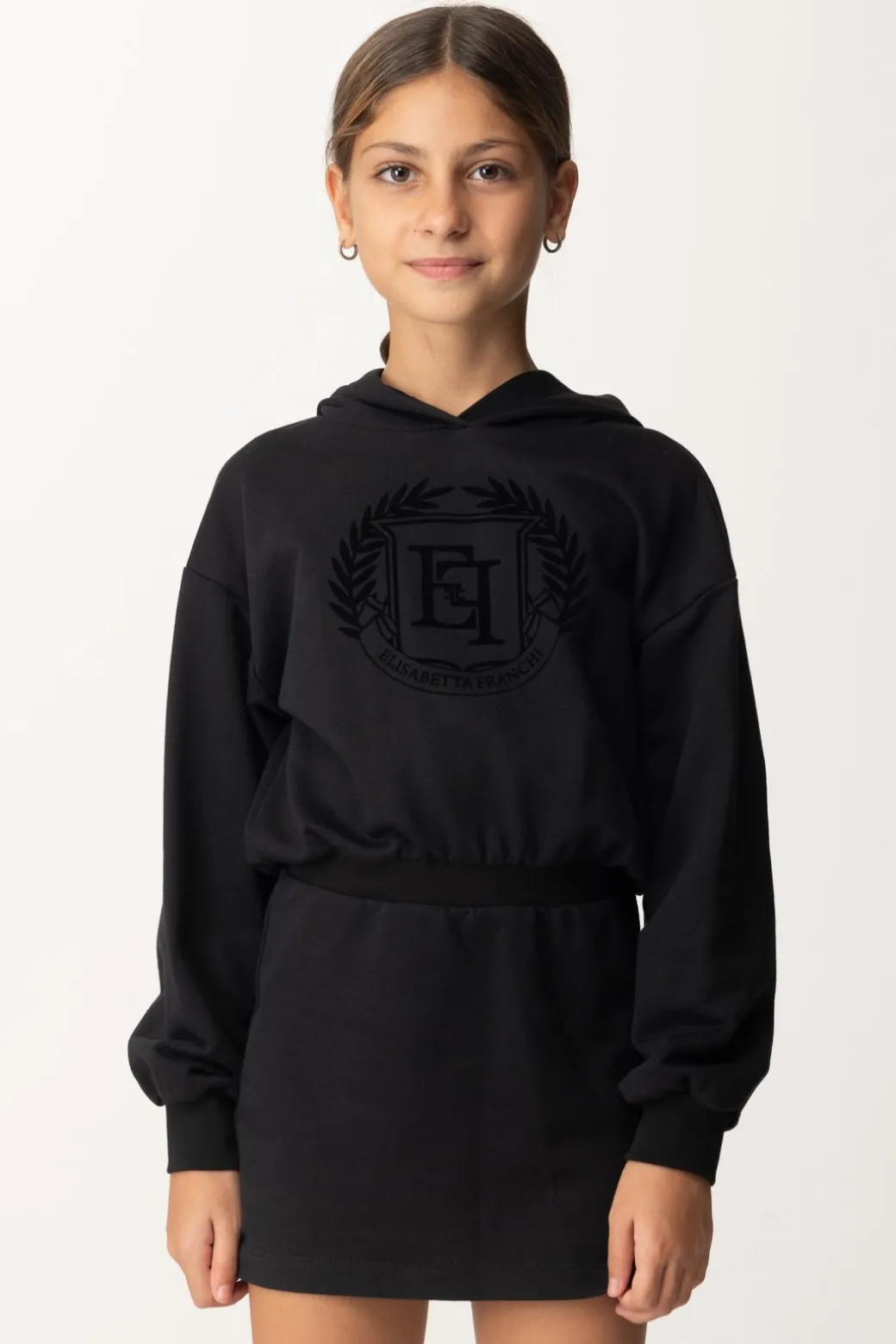 Sportivo e divertente mini abito La mia bambina Elisabetta Franchi stile felpa, caratterizzato dal logo EF in stile stemma ricamato sul petto e cappuccio. Il punto vita è sagomato e crea un effetto blusato al top: un abito da bimba ma che non ha nulla da invidiare allo stile delle grandi!