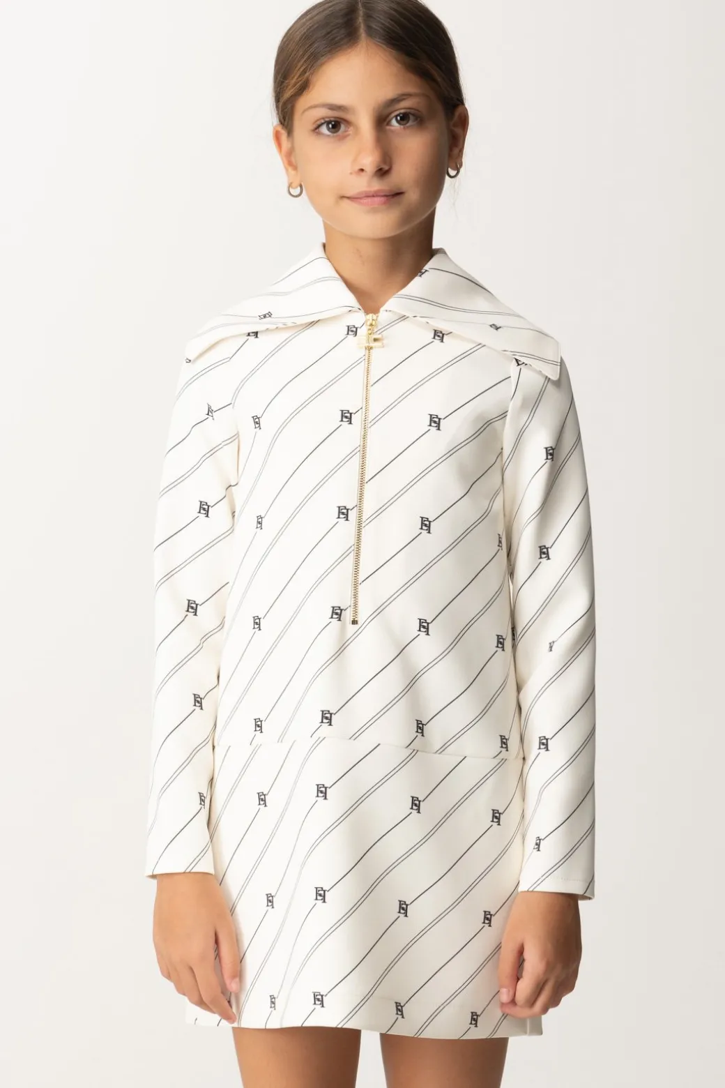 Allure casual chic per questo bell’abito La mia bambina Elisabetta Franchi in crepe con taglio corto e maxi colletto, interamente stampato a righe intervallate da loghi del brand. Bello da indossare sia con mocassini e simili che con stivaletti, un outfit sfizioso che non passerà inosservato.