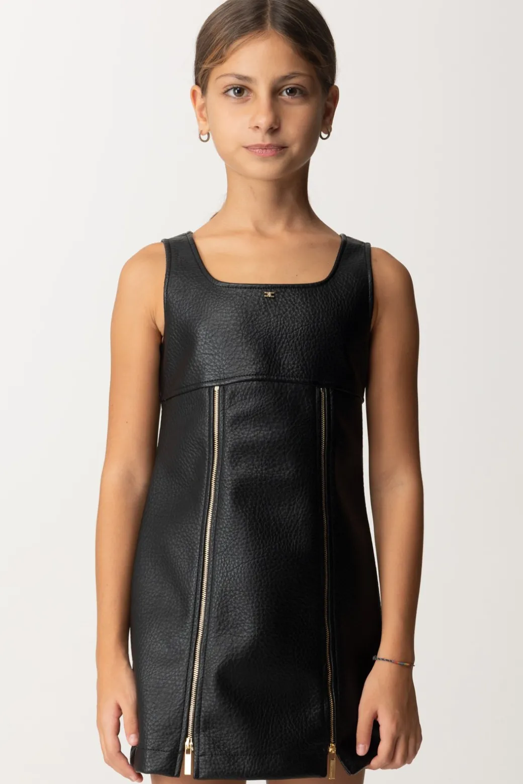 Un mini abito La mia bambina Elisabetta Franchi da vere signorinelle! Realizzato in eco-pelle con un fit boxy, è caratterizzato da zip frontali ornamentali e scollatura quadrata. Crea outfit anche in combinazione con camicette e maglie dolcevita, e completa il tutto con uno stivaletto: sarà super glamour!