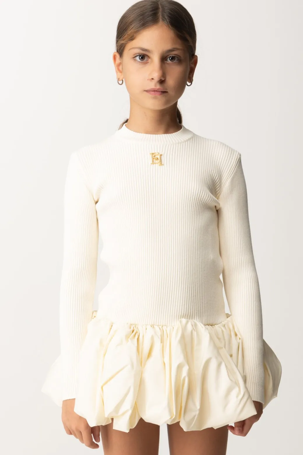 Sfizioso mini abito La mia bambina Elisabetta Franchi caratterizzato dall’accostamento di un top in maglia di viscosa a costine a una deliziosa gonnellina a palloncino che ne movimenta il design. Un outfit carinissimo per eventi speciali, magari non troppo formali, e non solo, da completare tanto con scarpette eleganti quanto con un anfibio per una declinazione più glamour del look.