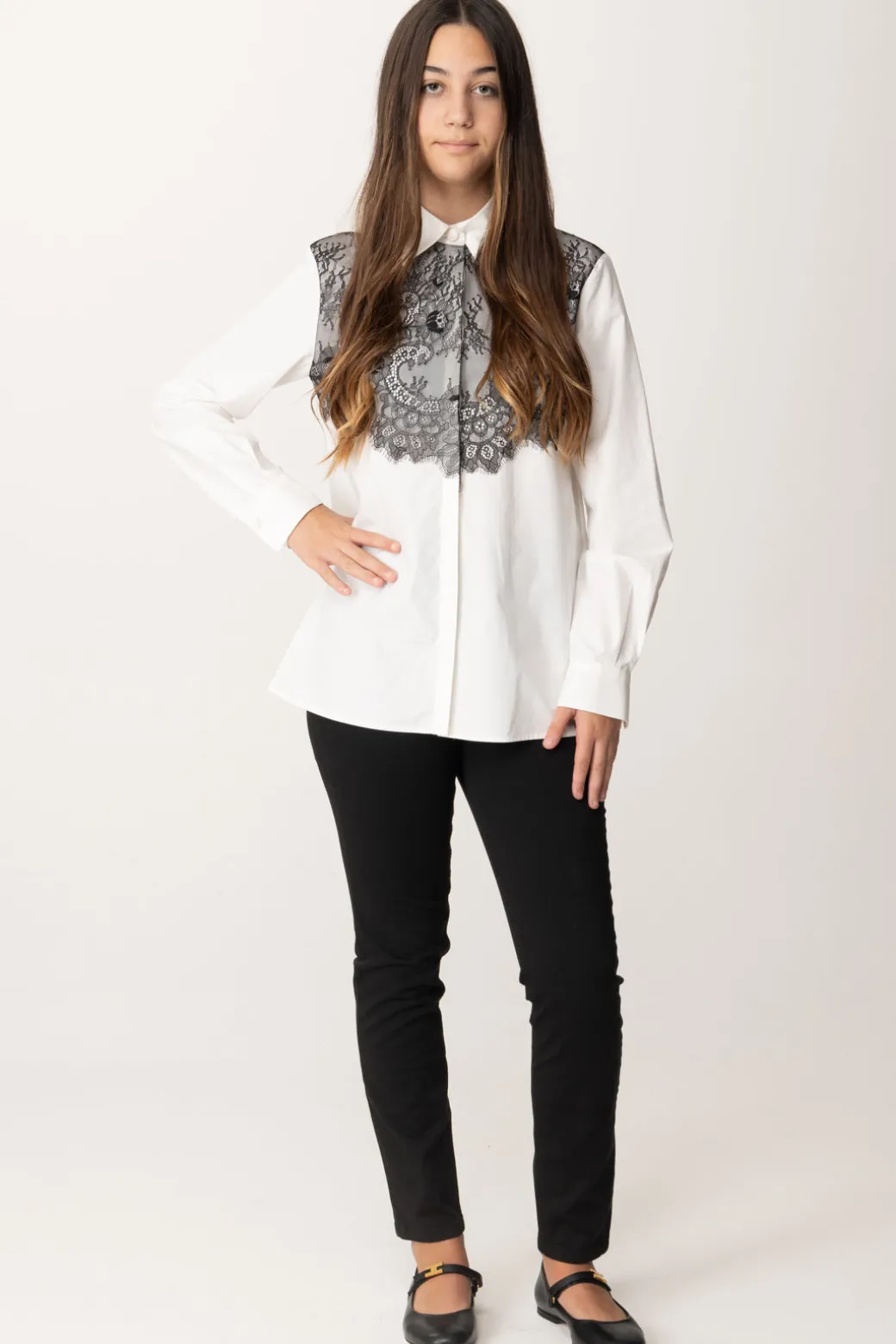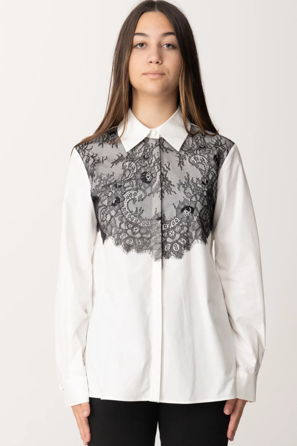 Inedita e delicata al tempo stesso, questa camicia Elisabetta Franchi La mia bambina ha la sua nota originale nell’inserto in pizzo sulla parte alta che crea un interessante gioco di colori oltre che abbellire il capo con la delicatezza del ricamo a tema floreale. Sarà perfetta per completare outfit eleganti ma anche per dare un tono chic a denim e bottom in effetto pelle.