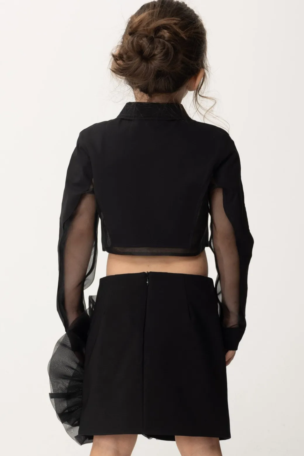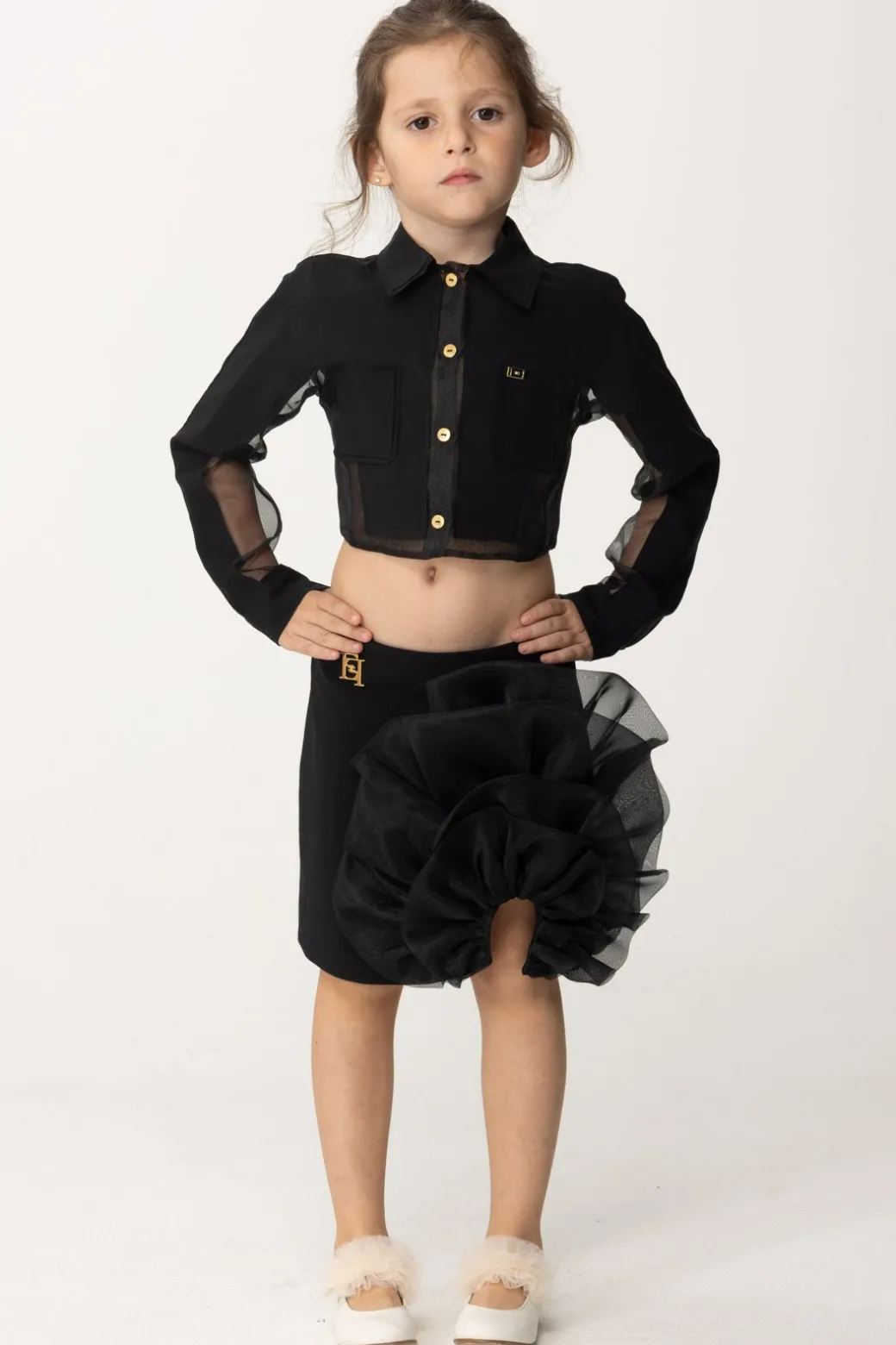 Con un taglio corto slim, la camicia Elisabetta Franchi la mia Bambina diventa la compagna perfetta per tutte le piccole amanti della moda, dal mattino alla sera! A renderla speciale sono sicuramente le maniche con tulle in trasparenza e i dettagli in oro (bottoni e placca logata) che aggiungono luce!
