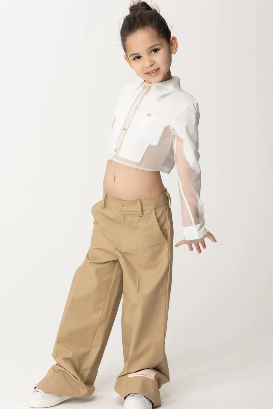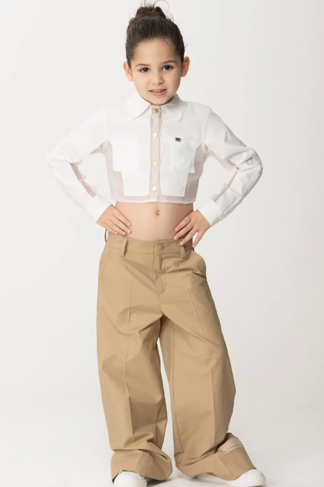 Un capo formato piccolo ma ispirato a quello delle grandi: sfiziosissima camicia La mia bambina Elisabetta Franchi con taglio corto e inserti in trasparenza nel busto e nelle maniche lunghe, per un risultato finale versatile che starà bene con tantissimi bottom della stagione. Taschine sul petto e abbottonatura frontale con bottoncini logati: ogni dettaglio merita attenzione, in questo top!