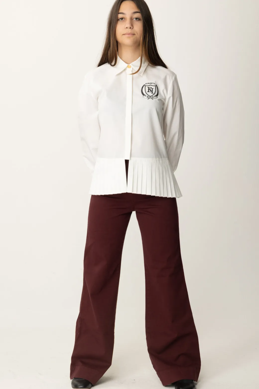 Con i jeans per un outfit casual chic, ma anche con bottom eleganti sia a pantalone che a gonna, questa camicia Elisabetta Franchi La mia bambina è davvero irresistibile, con la sua baschina plissettata e il ricamo logo a contrasto di colore in stile college. Versatile al punto giusto, perfettamente al passo coi tempi.