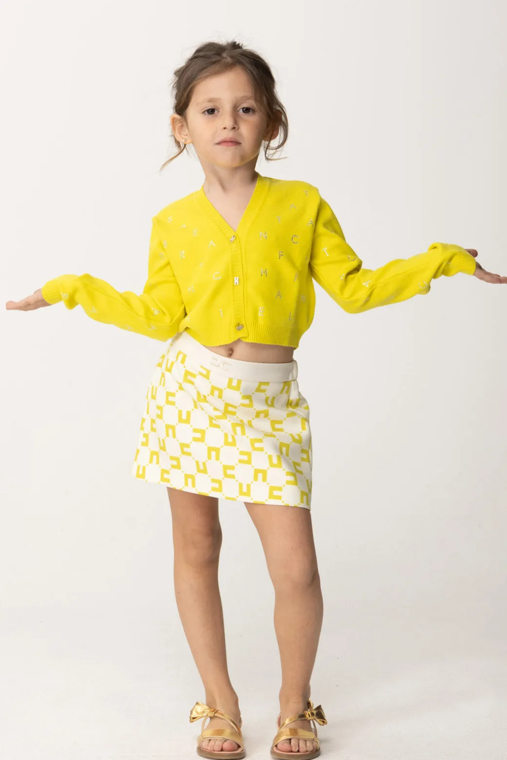 Questo cardigan Elisabetta Franchi la mia Bambina rende più chic anche gli outfit più casual, il suo tocco speciale è dato dal lettering all-over realizzato con mini strass luminosi che richiamano i bottoni logati.