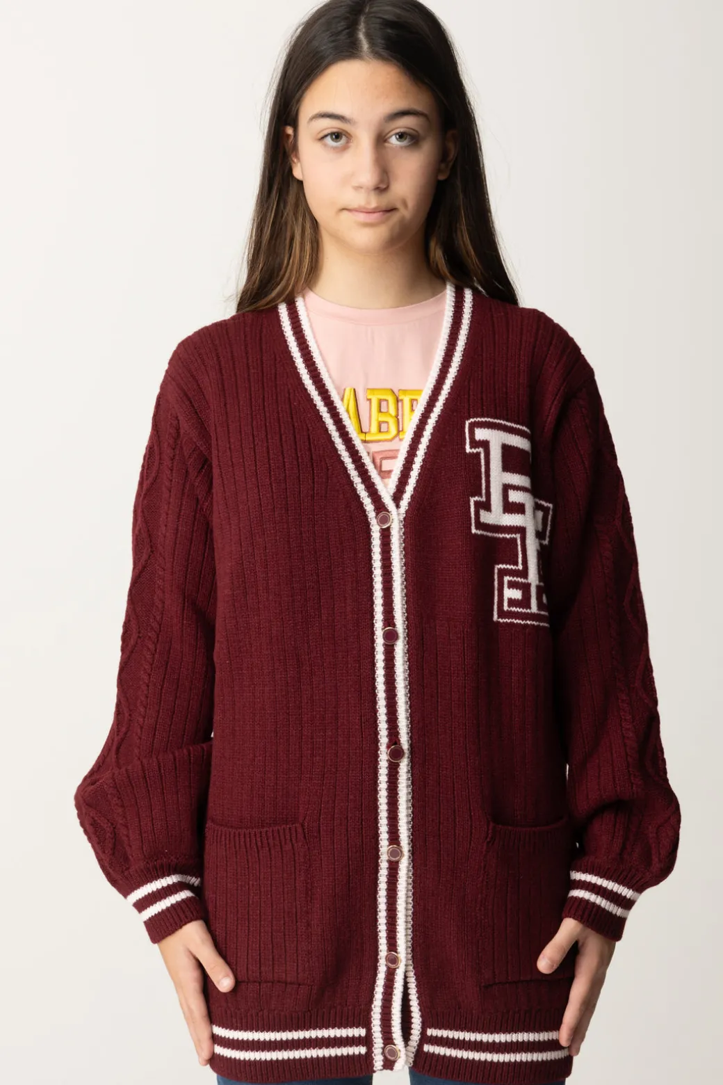 Se ami gli outfit a strati, allora amerai questo cardigan Elisabetta Franchi La mia bambina, che non solo aggiunge un capo all’outfit, ma aggiunge un sacco di stile! Ricamo logo sul petto in stile college, il taglio è lungo e i profili sono caratterizzati da bande a contrasto di colore. Lo scollo a V è perfetto per i tuoi abbinamenti: camicette, maglie dolcevita e tutto quello che vuoi per un outfit casual chic, comfort e al passo coi tempi.