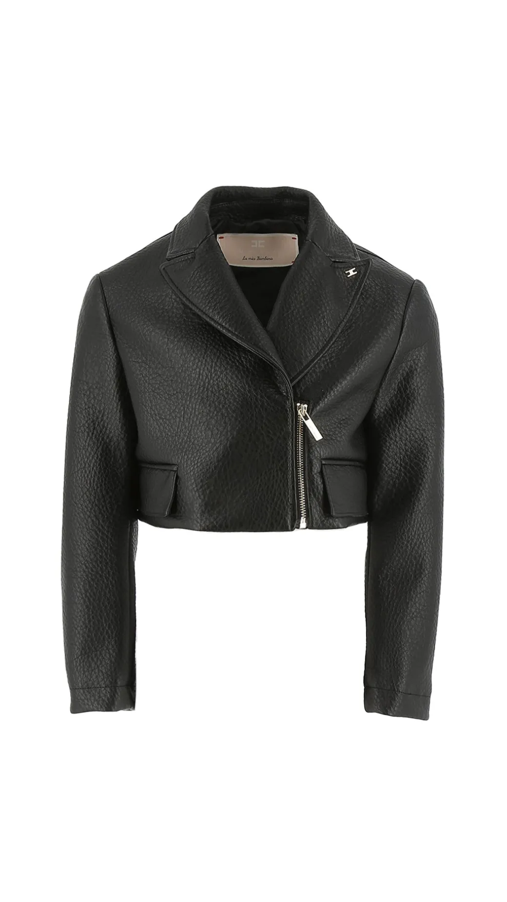 Un capo pieno di grinta per signorine piene di energia: il chiodo Elisabetta Franchi La mia bambina è la versione girl di questo capospalla intramontabile, realizzato in versione crop e con materiali sintetici effetto pelle martellata. Piccole patte in vita e chiusura con zip decentrata, un vero tocco di stile per i suoi outfit casual ma non solo. Placchetta logo CC sul risvolto del colletto.