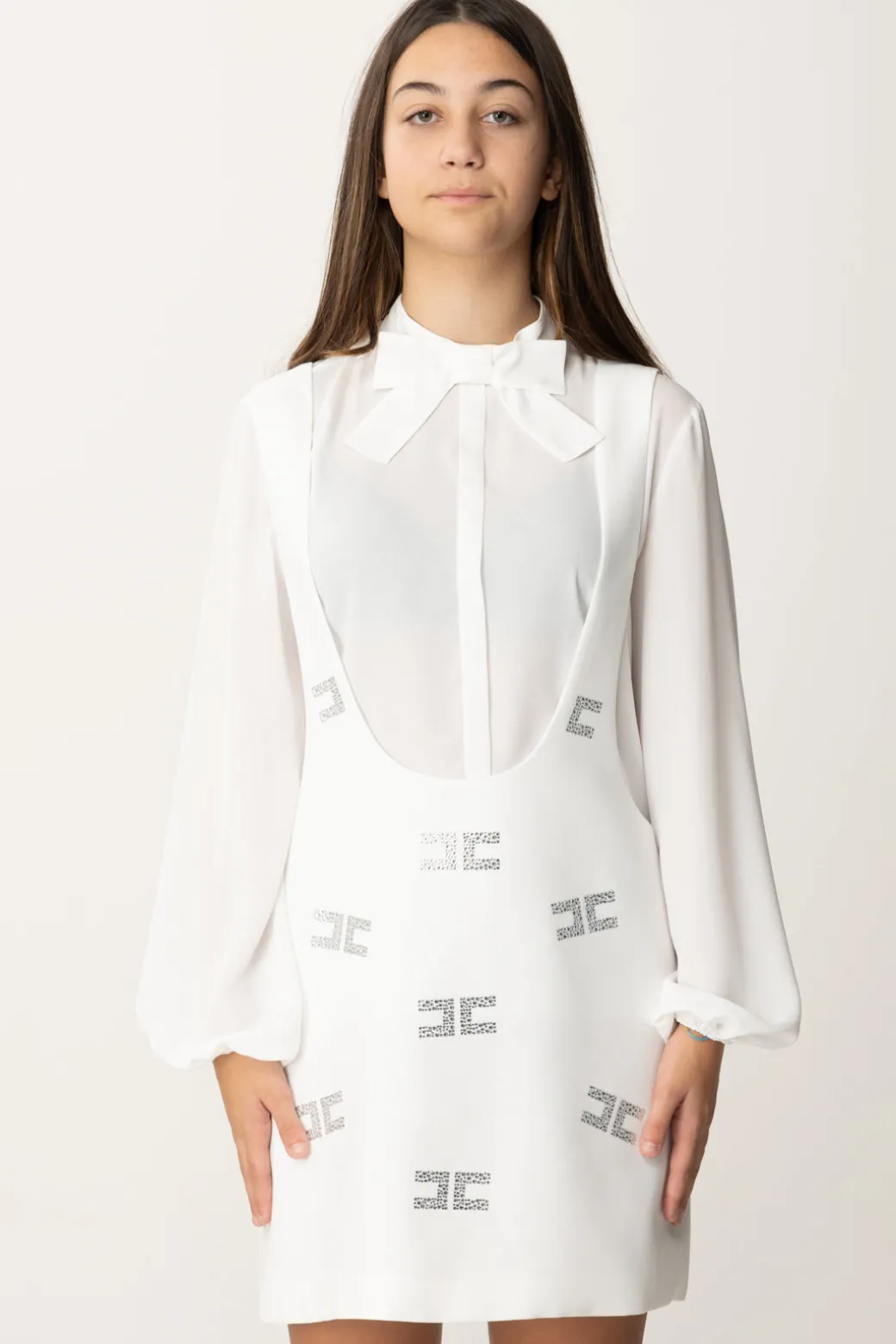 Eleganza senza stress: un outfit scamiciato e camicia Elisabetta Franchi La mia bambina che acquisti già completo, per un abbinamento perfettamente… perfetto! Camicia con fiocco al colletto e maniche a sbuffo, perfettamente matchata con uno scamiciato in tinta caratterizzato da pattern logo CC realizzato con strass. Cosa manca? Una bella scarpa chic e un evento in cui sfoggiarlo.