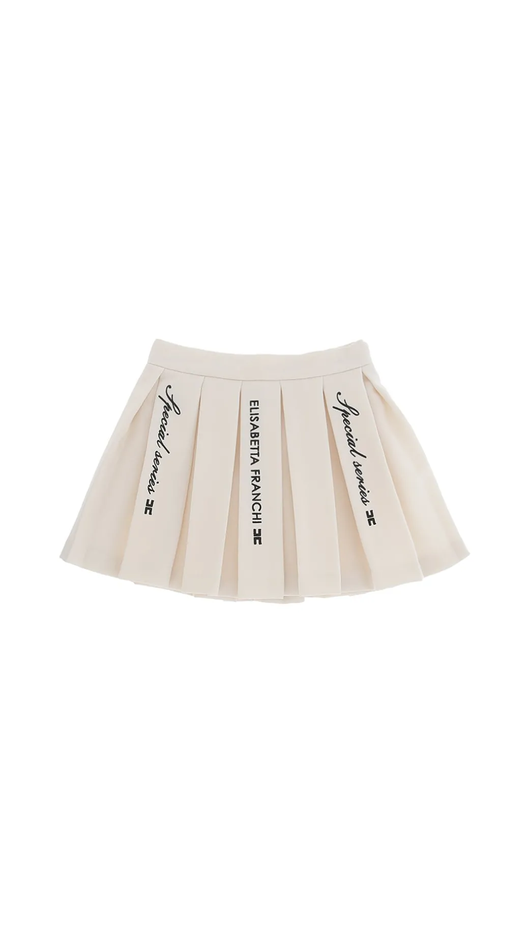 Special Series? Special outfits! Una esclusiva minigonna Elisabetta Franchi La mia bambina con delle belle pieghe caratterizzate da ricamo a contrasto di colore che aggiungono una nota inedita e sofisticata a questo capo. Perfetta per eventi e cerimonie, da combinare con uno dei tantissimi top della collezione e un bel paio di ballerine per un tocco bon ton.