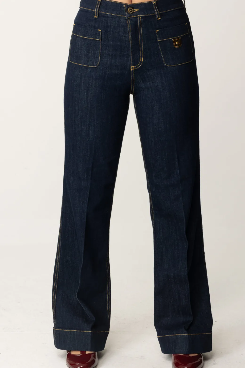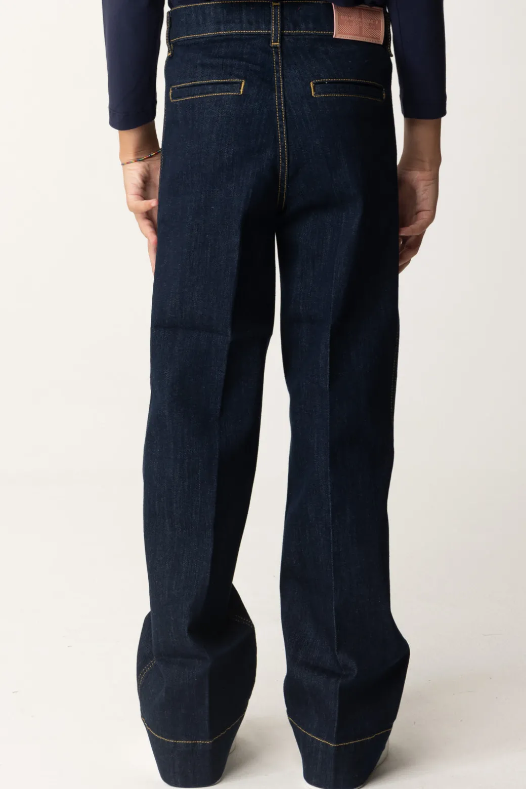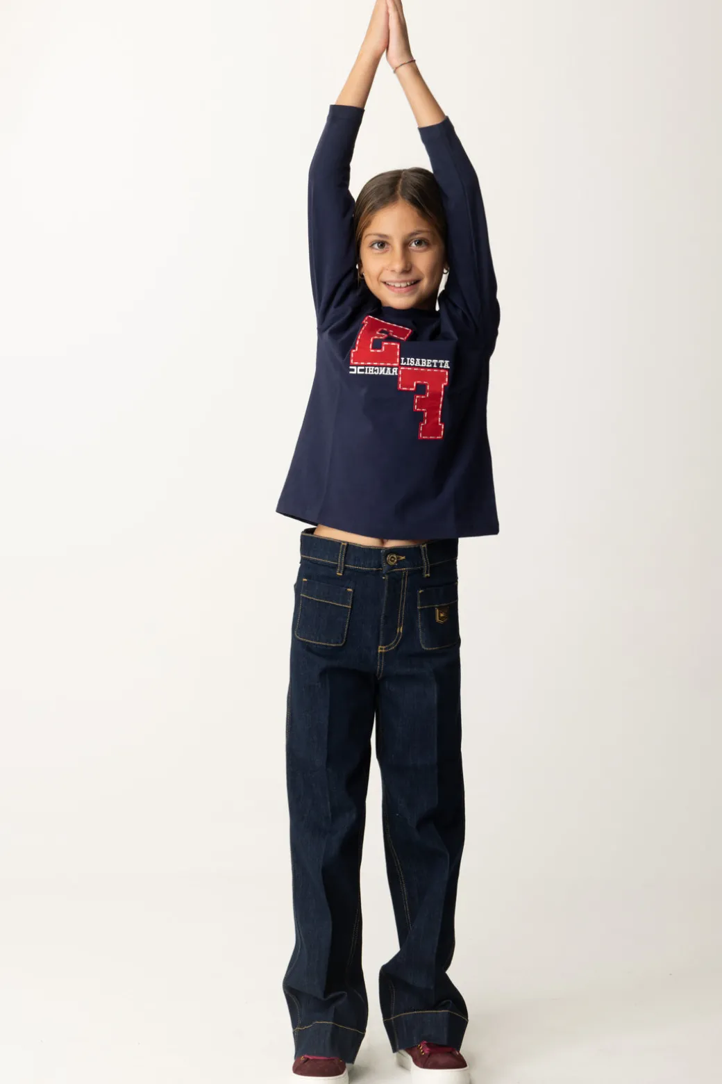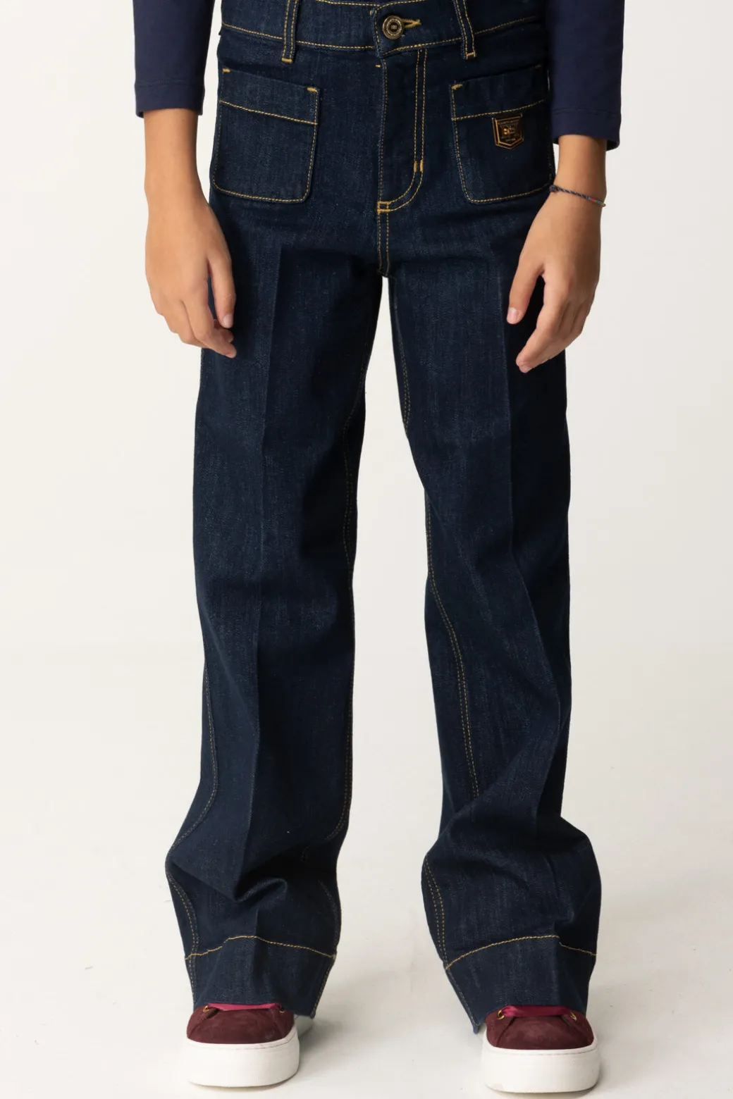 Lavaggio scuro e placca logo in formato scudetto sono le caratteristiche di questi jeans La mia bambina Elisabetta Franchi a gamba dritta. Un capo cool e facile da abbinare a tutti i top della stagione, casual e non solo. Cuciture a contrasto di colore come ulteriore nota di stile!