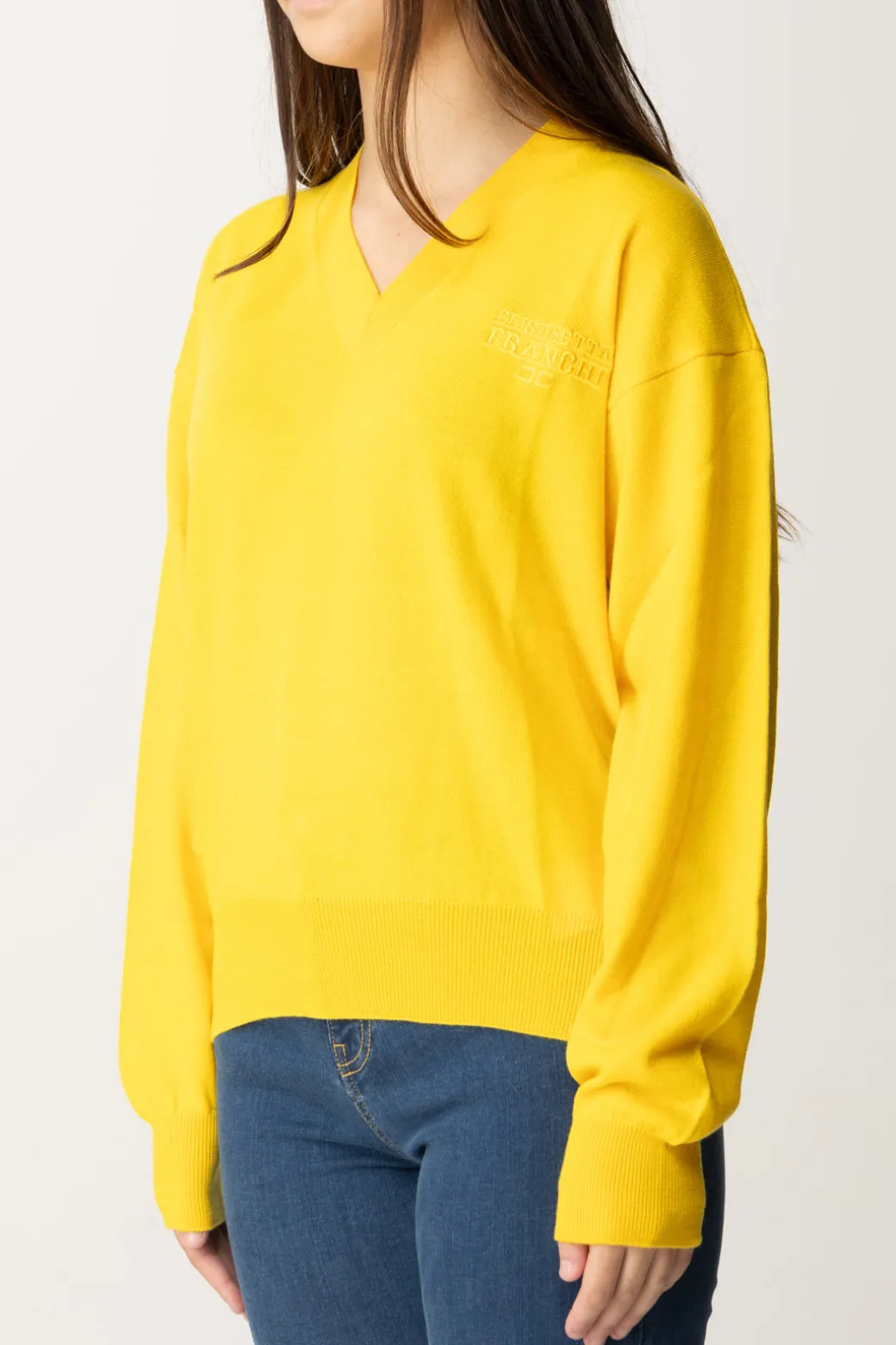 Una maglia Elisabetta Franchi La mia bambina che apprezzerai per la sua versatilità: basic al punto giusto, con scollo a v a costine e ricamo logo in tinta sul petto, è un passe-par-tout per outfit da tutti i giorni e casual chic. Sfrutta la scollatura per giocare con le sovrapposizioni: non la vedresti benissimo con una camicetta sotto?