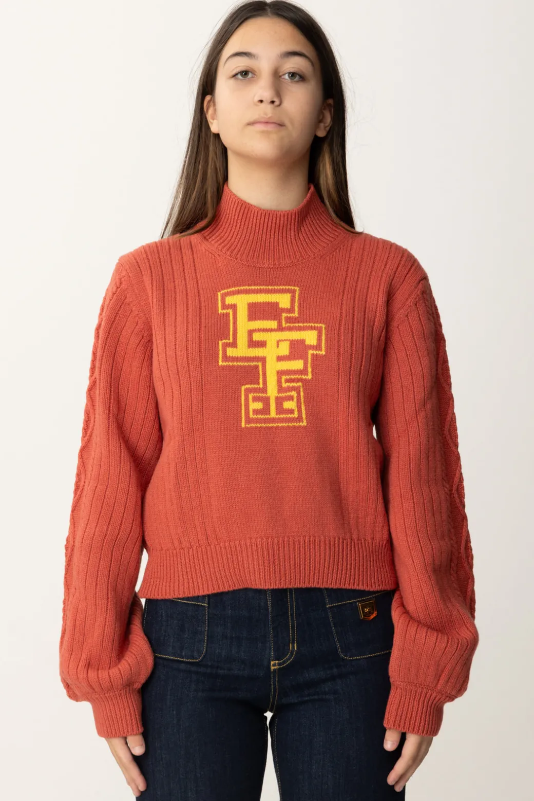 Maglione Elisabetta Franchi La mia bambina realizzato in lana merinos, con logo a contrasto di colore sul petto e altri dettagli che richiamano il design dei maglioni artigianali, con tracce lungo le maniche e un bel collo alto a costine. Perfetto da indossare sui denim per outfit casual chic, ma anche da indossare sopra maxi camicie per un risultato tanto cool quanto teen.
