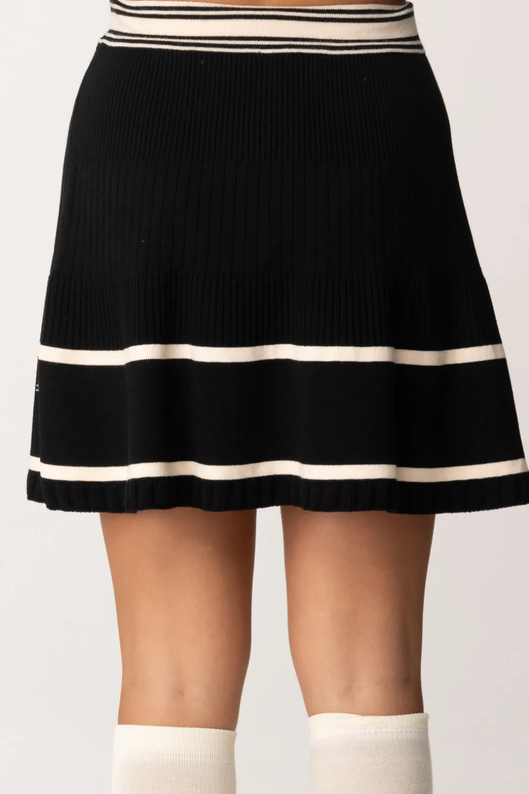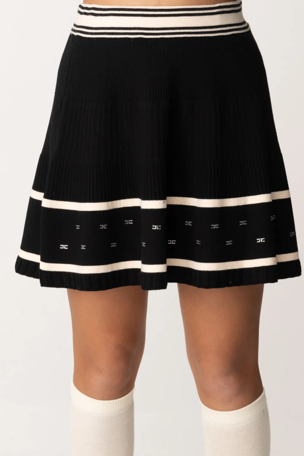 Sfiziosa minigonna Elisabetta Franchi La mia bambina in maglia, con design scampanato e arricchita da dettagli a contrasto di colore e in strass, come la banda con i piccoli logo CC. Un capo pratico e chic, da completare con un bel cardigan o una maglia o felpa color block.