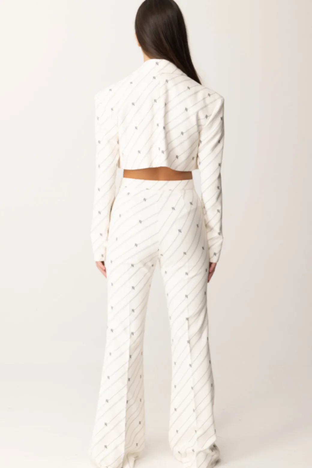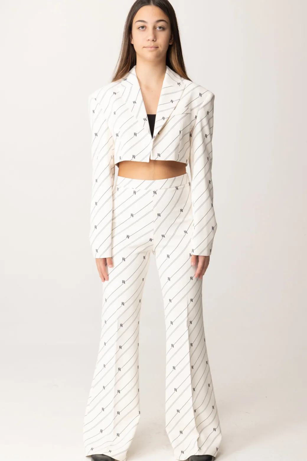 Eleganza senza pensieri con questo outfit completo Elisabetta Franchi la mia Bambina , composto da una deliziosa giacca crop con colletto con revers e maniche lunghe e un bel pantalone flare, accomunati dalla stampa righe e logo tipica della collezione. Non ti resta che abbinare un top e una bella scarpa e la tua piccoal lady avrà uno stile inconfondibile!