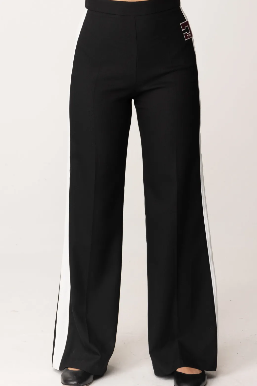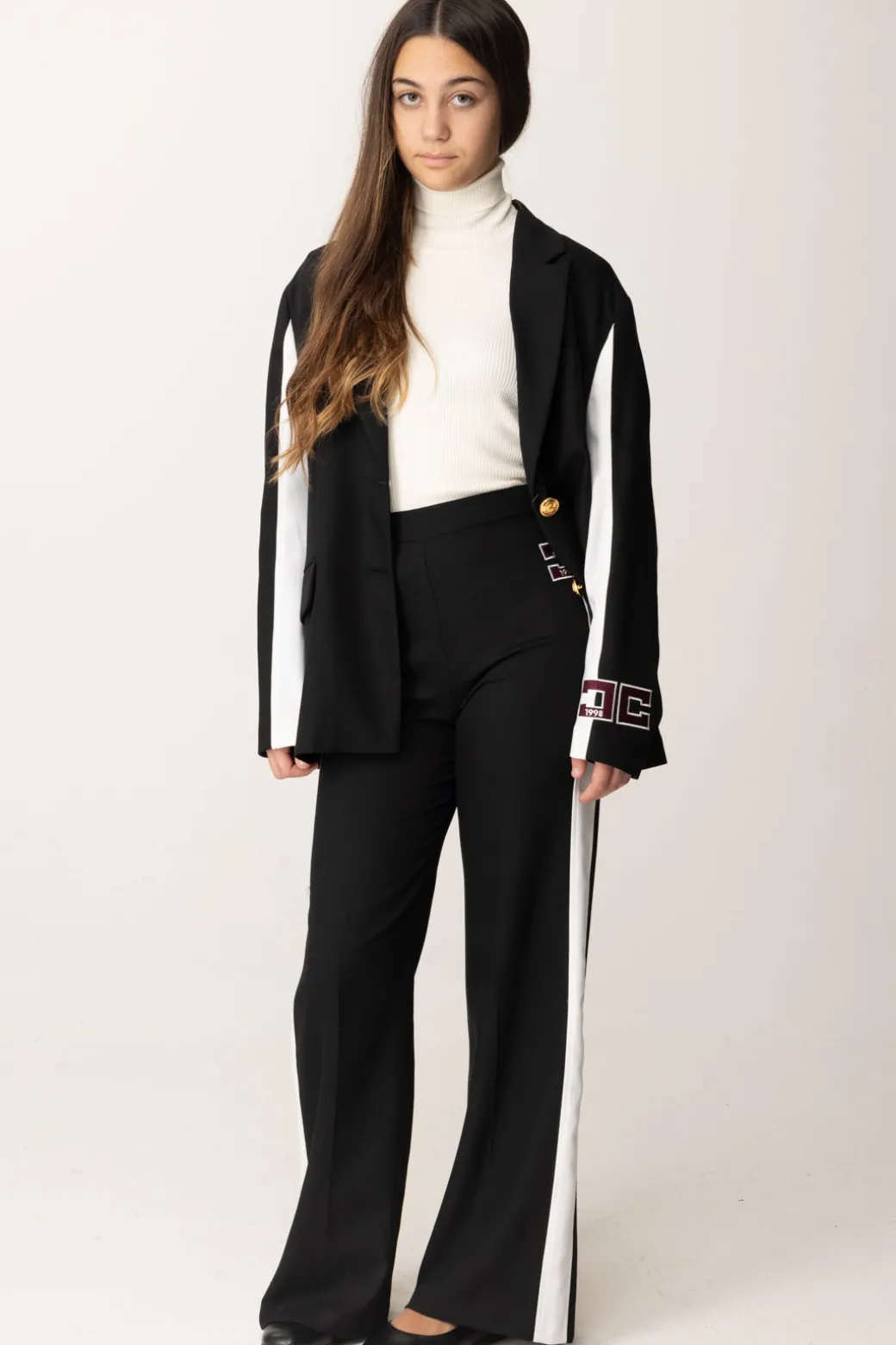 Sai che nella collezione c’è una giacca con cui puoi creare un completo a partire da questi pantaloni Elisabetta Franchi La mia bambina? Eleganti e contemporanei, con l’inserto a contrasto di colore e il logo maxi sul fianco, un capo esclusivo perfetto in set con il capospalla, ma anche da solo con t-shirt con logo, bluse e camicette della collezione.