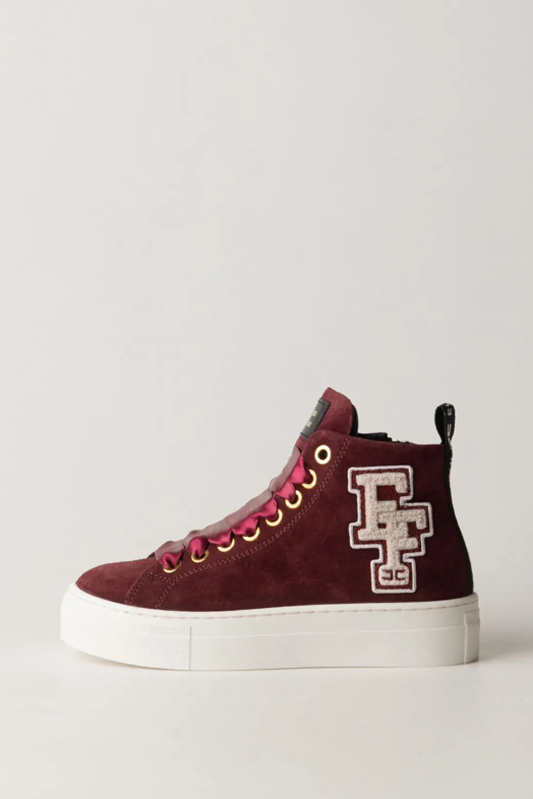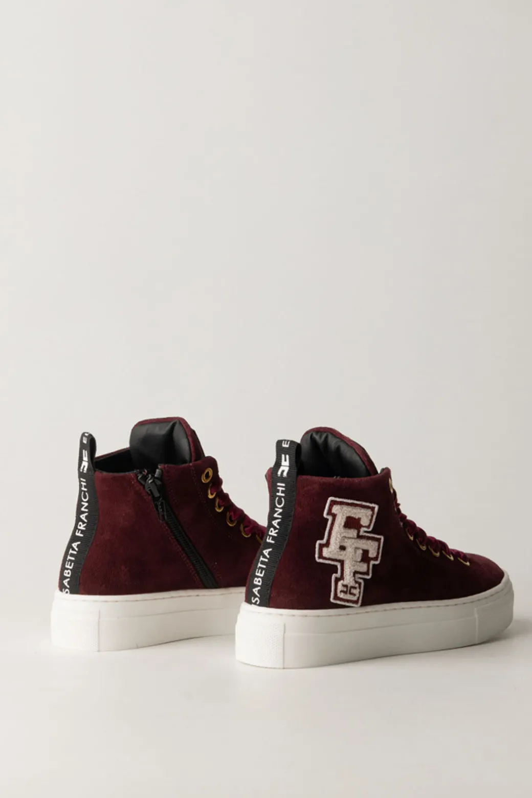 Pratiche scarpe da tutti i giorni, ma pensate sempre per aggiungere stile ad ogni look: sneakers alte La mia bambina Elisabetta Franchi realizzate in pelle scamosciata e ornate dall’applicazione del logo EF in punto spugna e da lacci a nastro ornamentali. Perchè? Perché si indossano grazie ad una pratica zip sul lato!