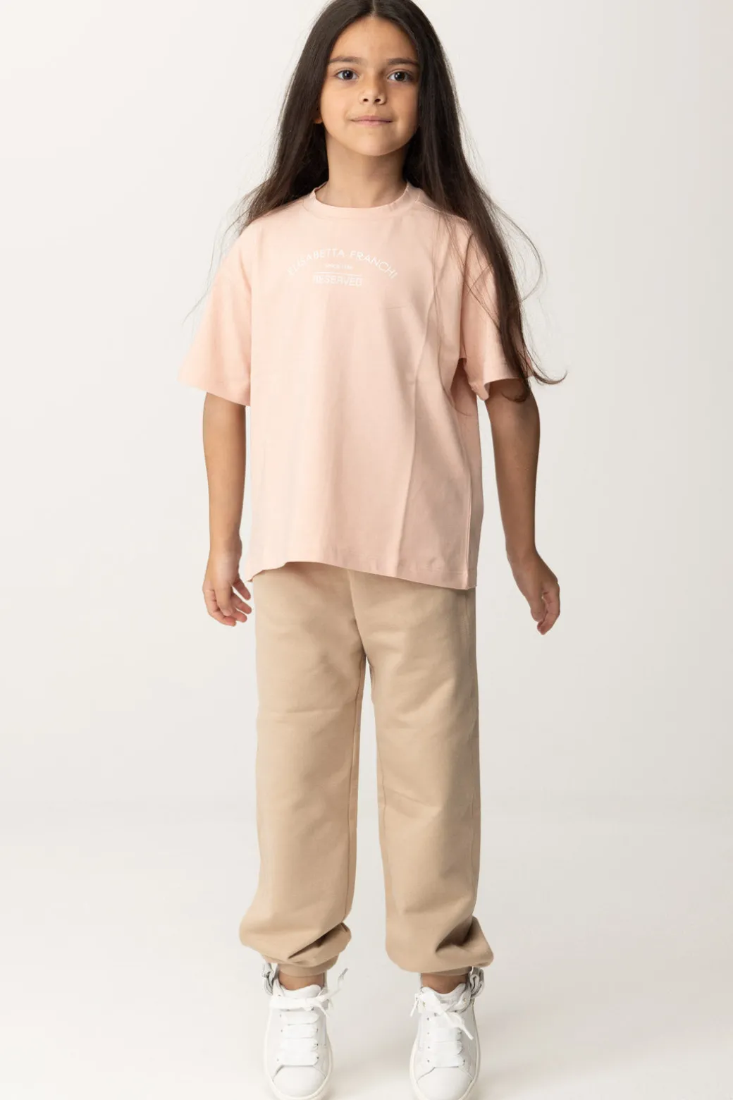 Una T-shirt Elisabetta Franchi Bambina dallo stile minimal impreziosito da una stampa logo lettering a contrasto, perfetta per esprimere personalità e originalità nel look quotidiano..