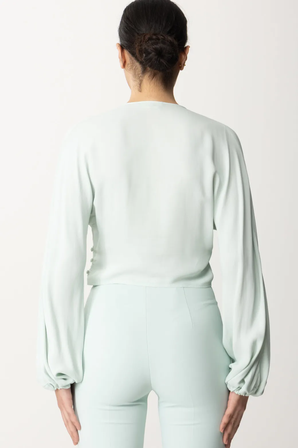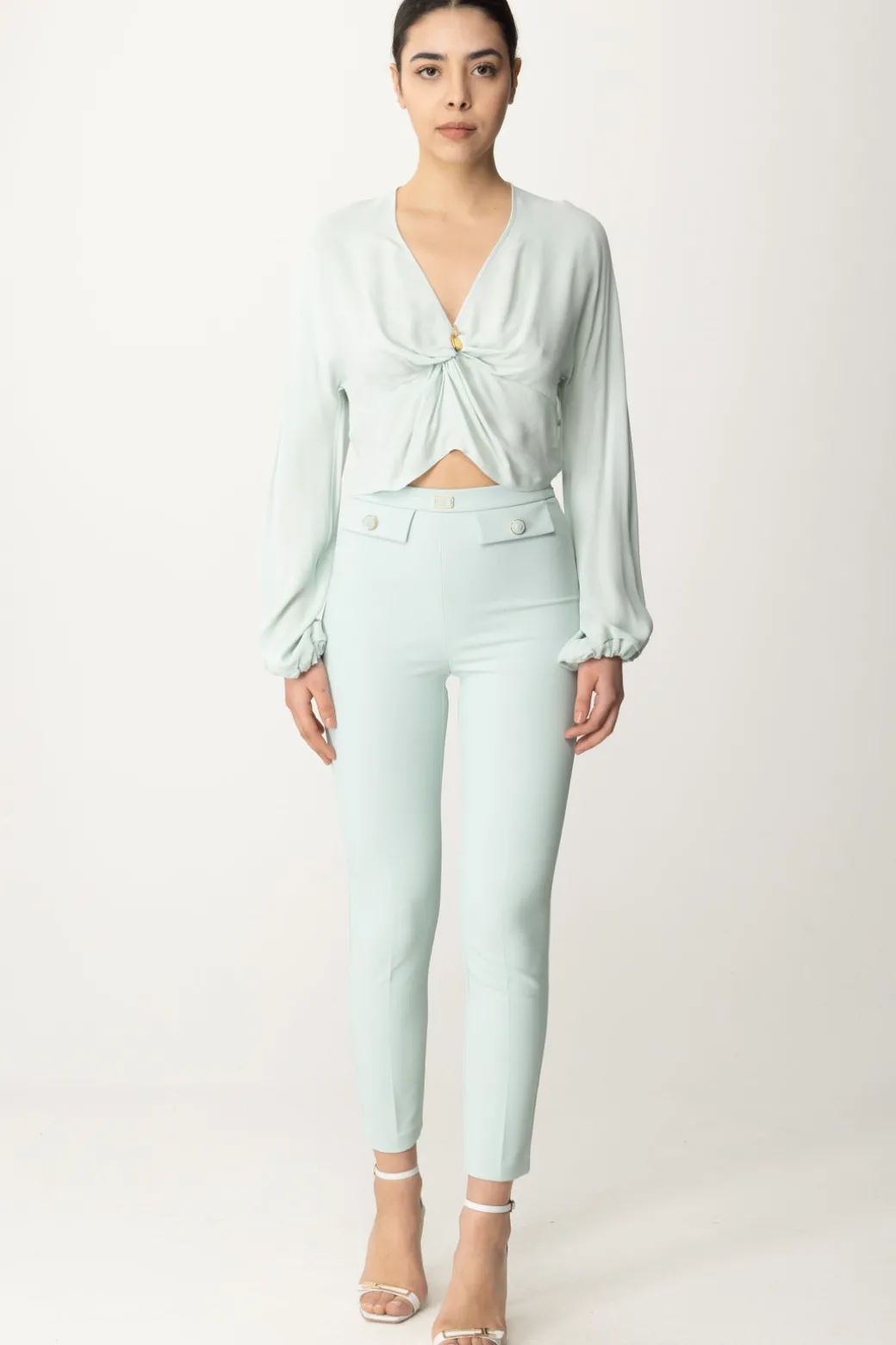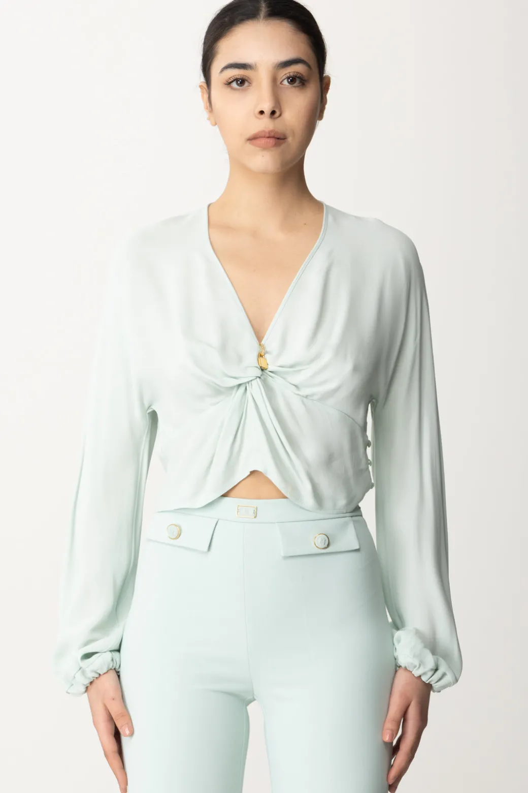 Una dichiarazione di femminilità e raffinatezza, la blusa cropped Elisabetta Franchi in doppia georgette di viscosa incanta con le sue maniche lunghe arricciate ai polsi e uno scollo a V che si conclude con un nodo impreziosito da charms in metallo dorato e strass. Un capolavoro di eleganza chic che si distingue per la sua grazia e il suo stile senza tempo.