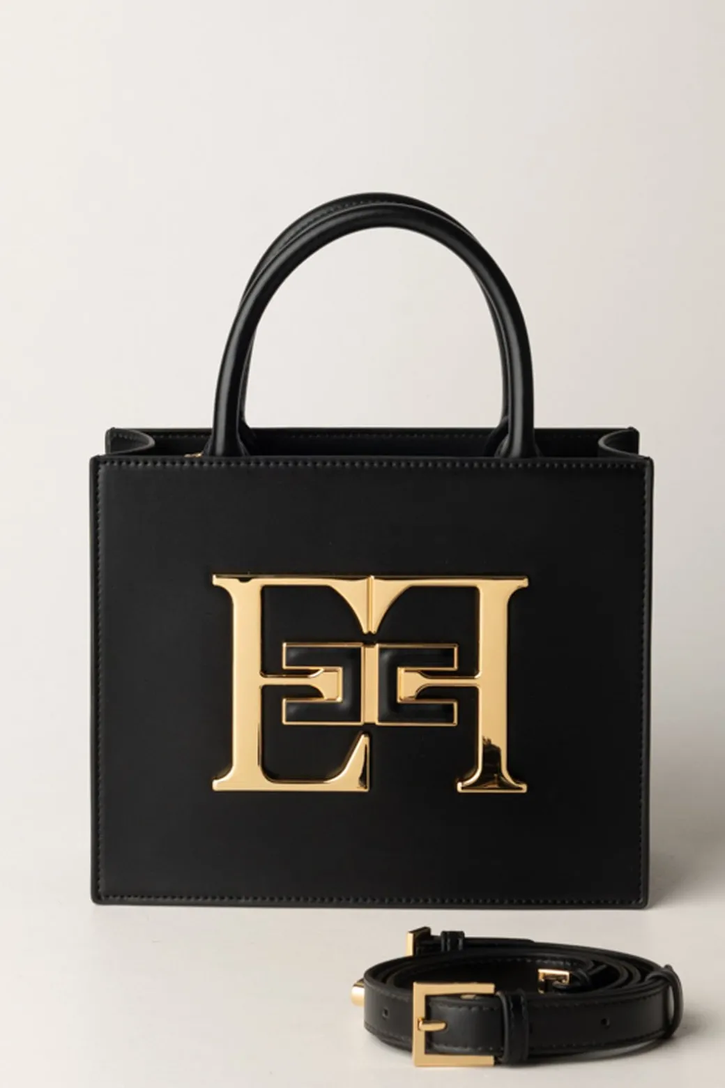Piccola borsa Elisabetta Franchi realizzata con un materiale effetto spazzolato e caratterizzata da maxi placca EF in metallo dorato e logo doppia C fasciato per un tocco di luce unico.