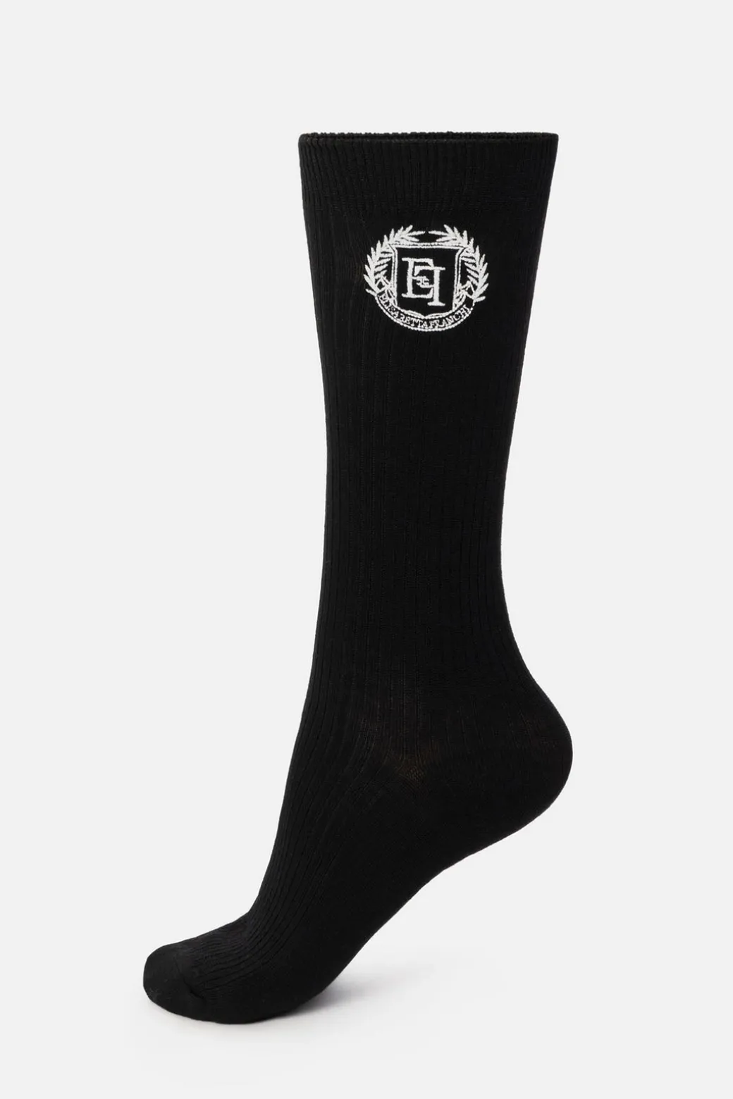 Calzini Elisabetta Franchi realizzati in morbido cashmere a coste e impreziositi da da stemma logo a contrasto di colore. L’accessorio must da abbinare ai tuoi mocassini o sneakers preferite!