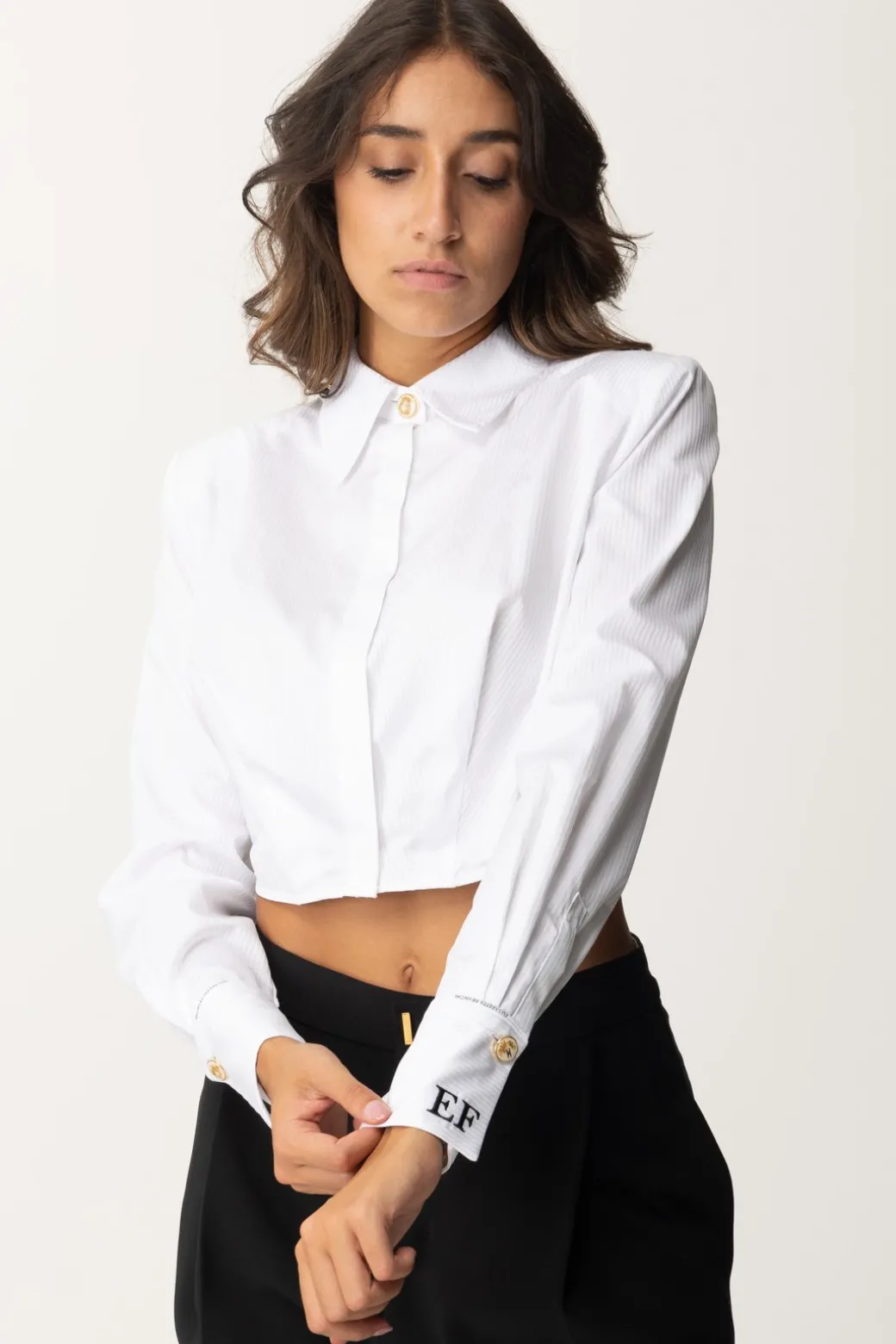 Camicia Elisabetta Franchi piena di elementi in direzione femminilità: il taglio crop, le pinces sul davanti e il fondo asimmetrico che valorizza fianchi e punto vita e, ultima nota di stile, il logo EF ai polsini che identificano la tua designer preferita. Perfetta con ogni look, dal più casual al più chic, a cui aggiungere la tua nota personale di carattere.