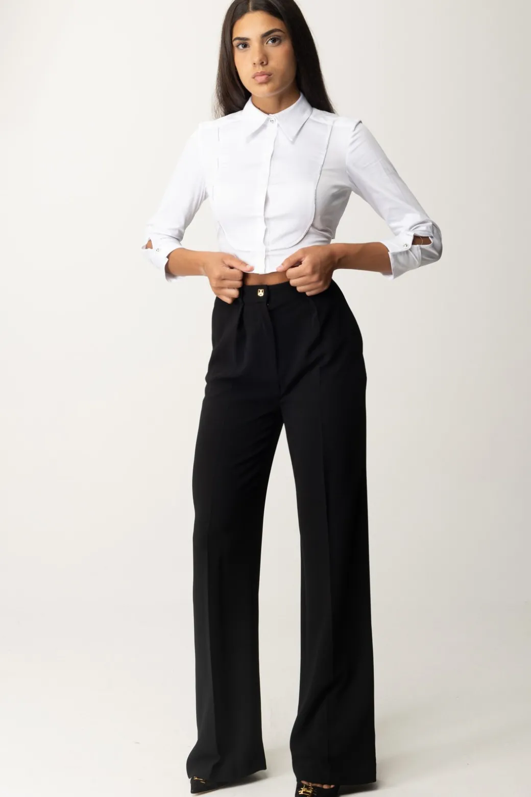 Una camicia Elisabetta Franchi che di classico non ha proprio nulla, e non solo per il tagglio crop! Un originale plastron con profili logati che ritornano anche ai polsini e l’elastico regolabile sul retro, che aggiunge un ornamento cool ai tuoi look. Ideale da indossare con denim e bottom casual, ma anche per dare un twist ai tuoi bottom più classici per un effetto glamour chic.