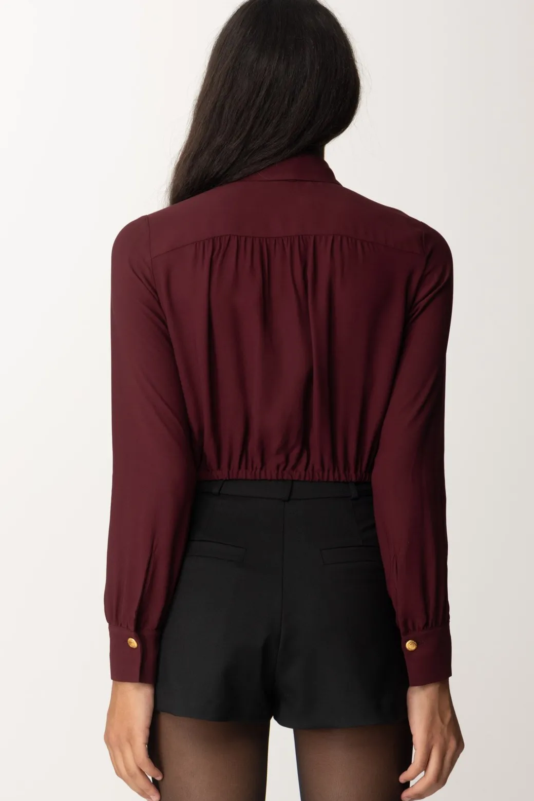 Camicia Elisabetta Franchi dal taglio crop caratterizzato dal punto vita elasticizzato, che aggiunge una nota casual a questo top. Coletto corredato da foulard da annodare a piacimento, un capo a metà strada tra il versatile e il bon ton per completare i tuoi outfit più svariati.