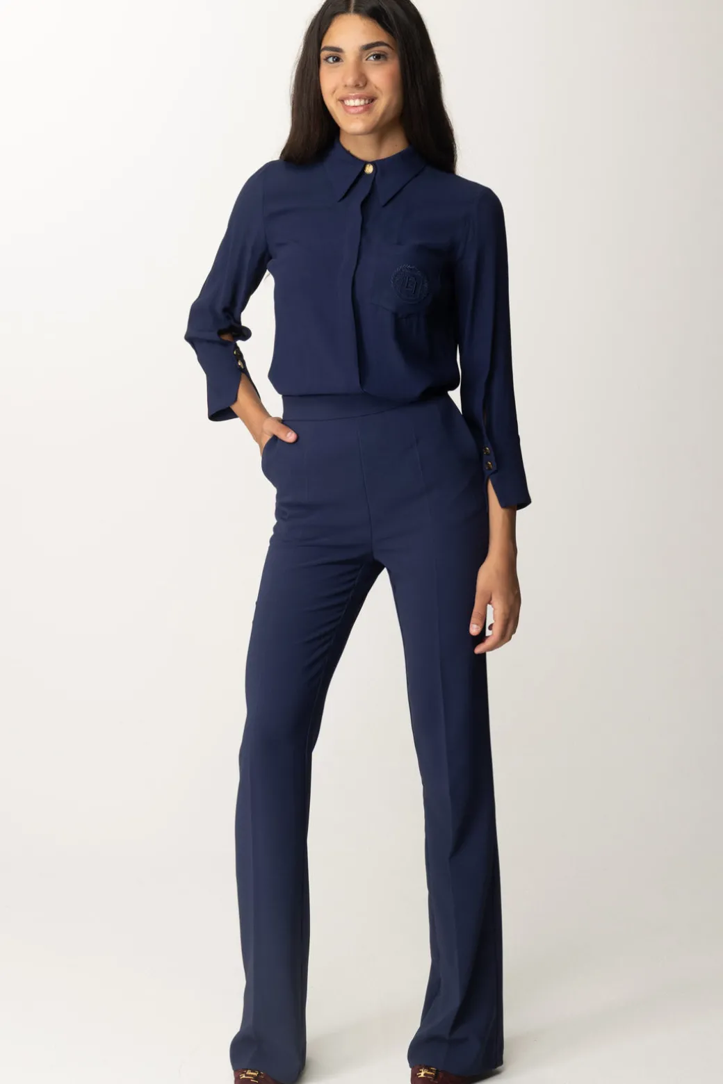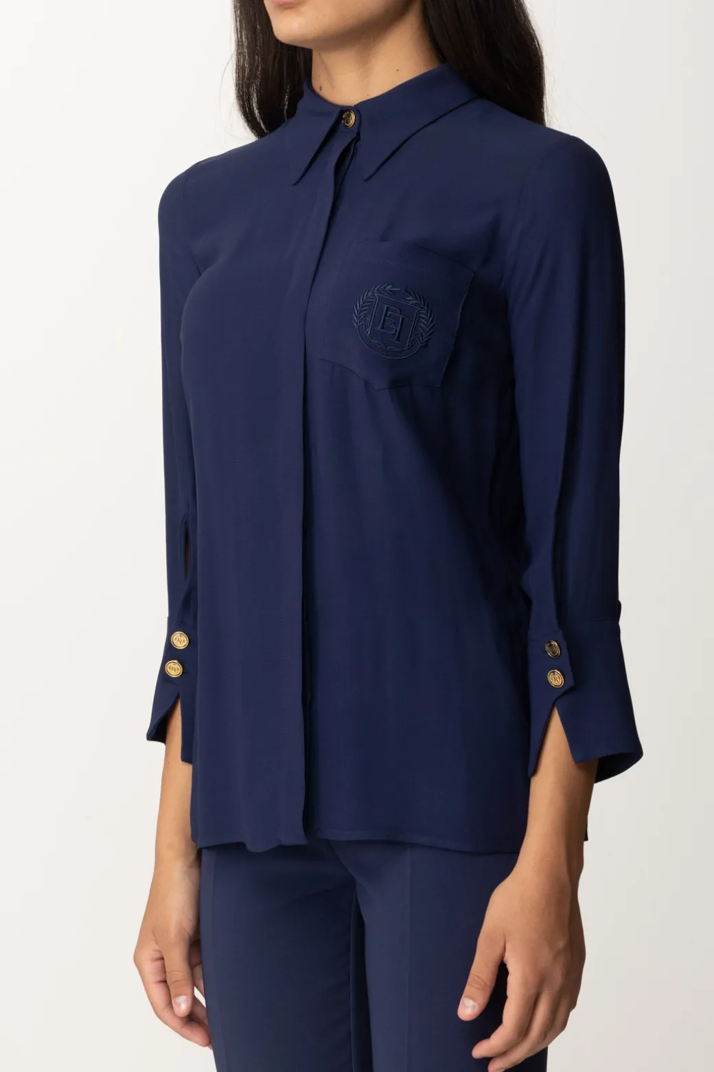 Sei alla ricerca di un top elegant e versatile? La risposta è questa camicia Elisabetta Franchi: sta bene in qualsiasi contesto e con qualsiasi bottom del tuo guardaroba. Semplice e raffinata, in morbida georgette, la sua caratteristica sono le maniche a tre quarti e la tasca con ricamo a filo logo tono su tono al petto.