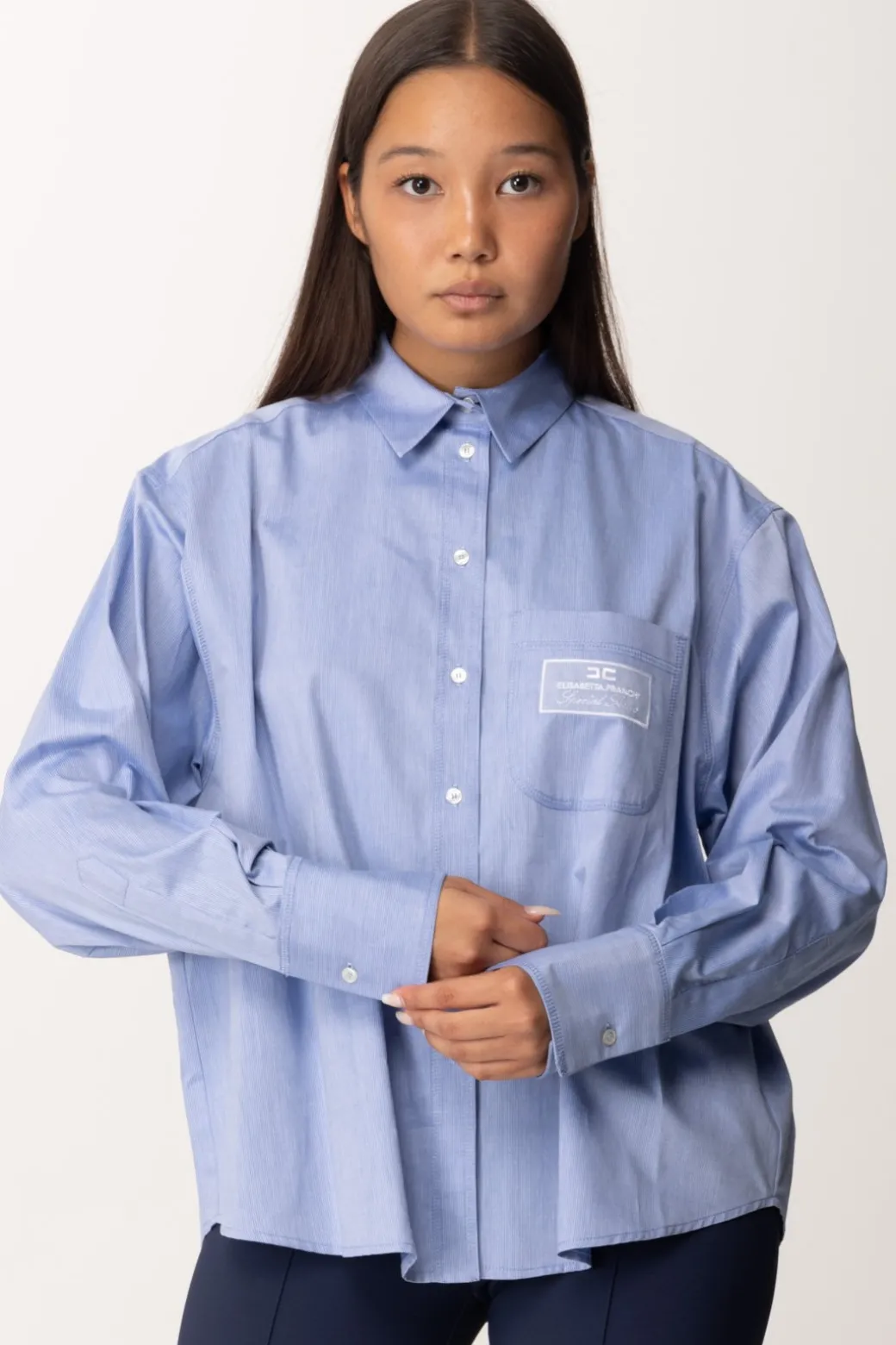 Perfetta per l’ufficio, perfetta per look trendy da tempo libero, perfetta sempre: amerai questa camicia Elisabetta Franchi a partire dal popeline di cotone con cui è relizzata, e poi per il suo fit ampio e morbido che la rende diversa dal resto del tuo abbigliamento basic. Etichetta con logo in organza al taschino e bottoncini lucidi per ingentilire ancora di più la tua mise.