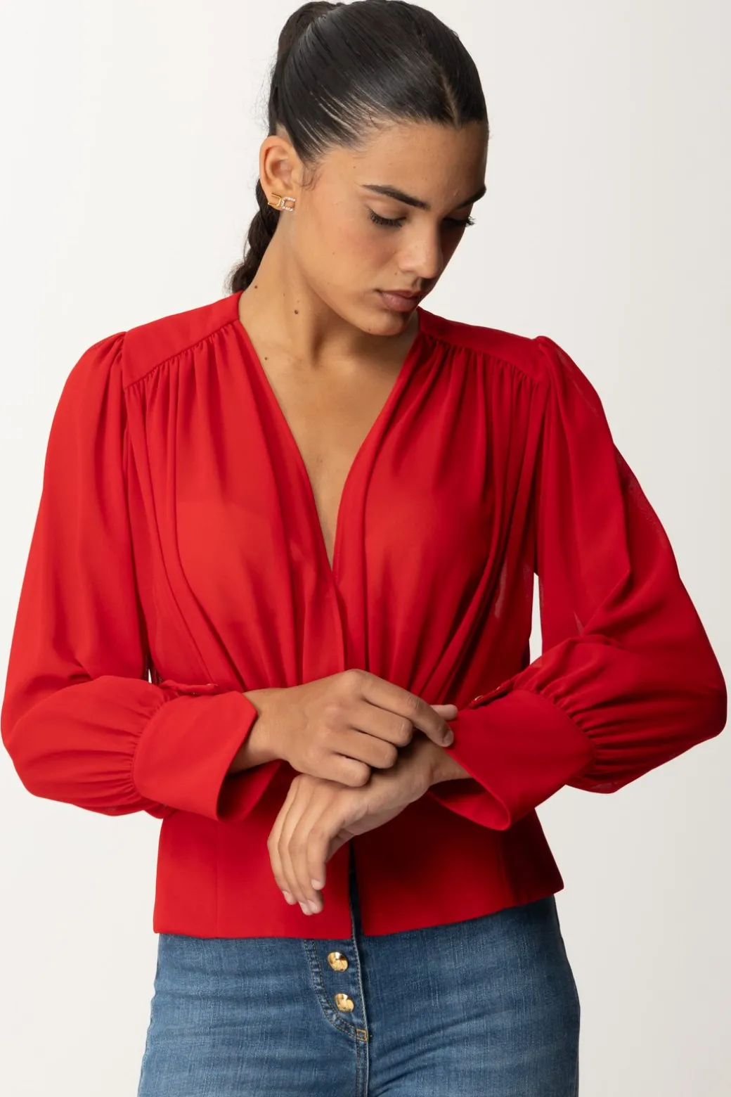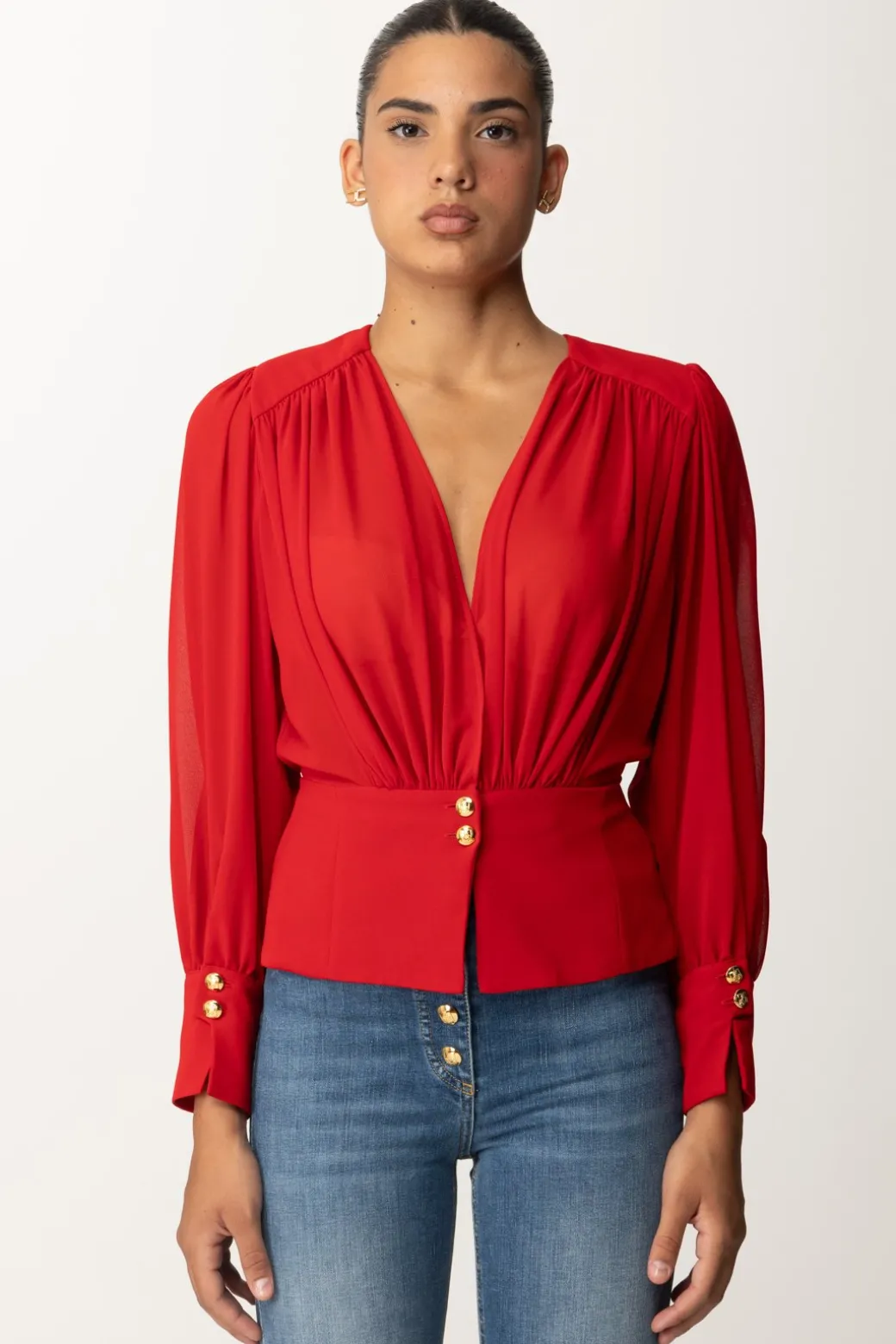 La particolarità di questa camicia Elisabetta Franchi in georgette sta nel contrasto tra le maniche e la parte del busto, morbida e abbondante con i suoi drappeggi, a l’aderenza del punto vita, una baschina con bottoncini dorati che avvolge la silhouette con chiusura a incrocio. Elegante e sofisticata, perfetta su sia denim che bottom eleganti.
