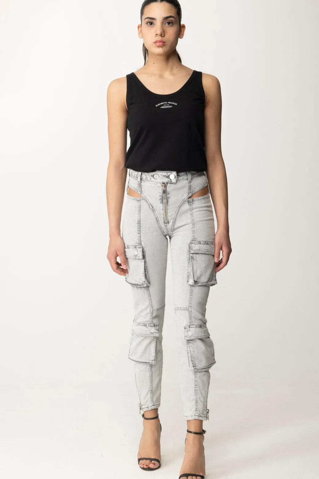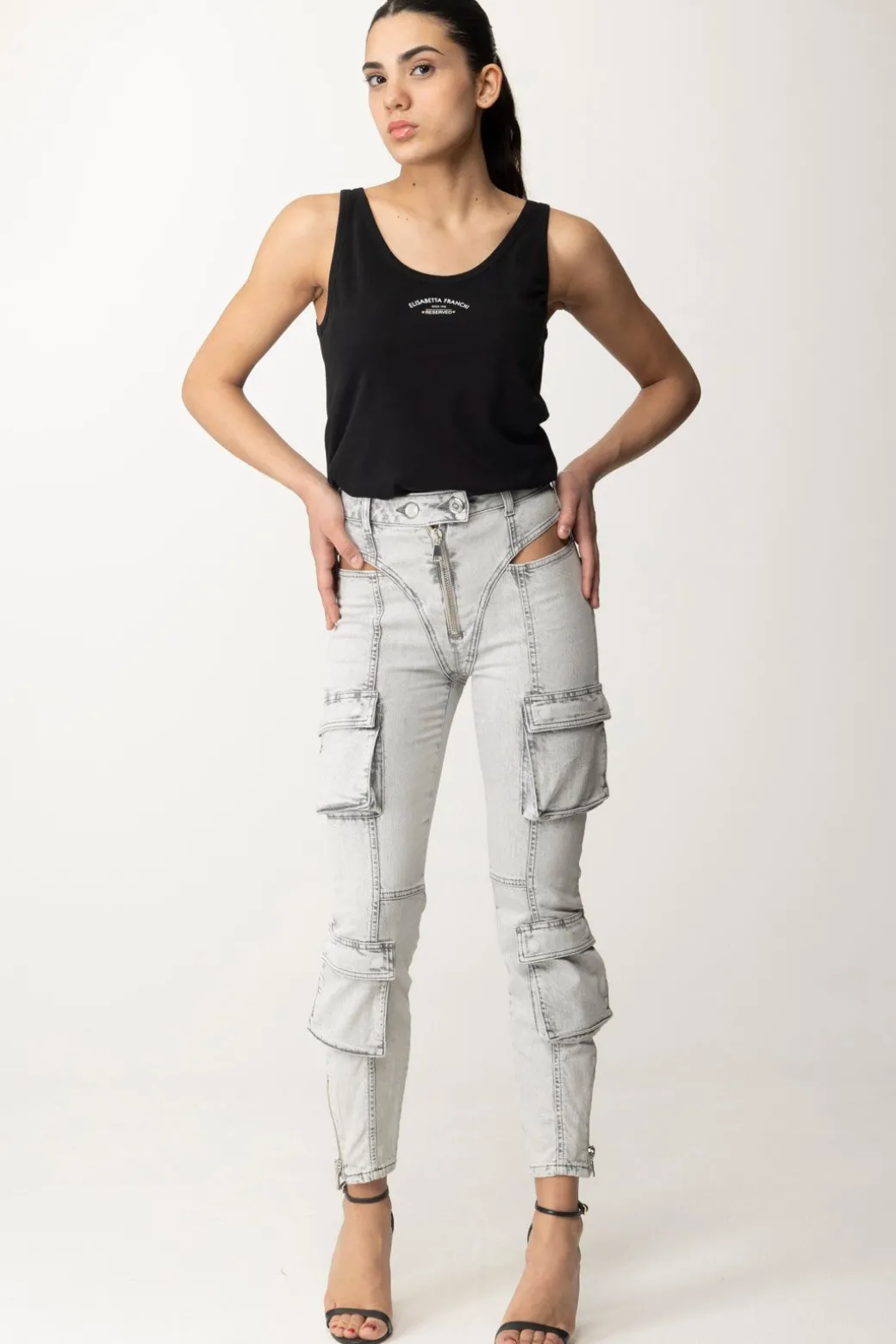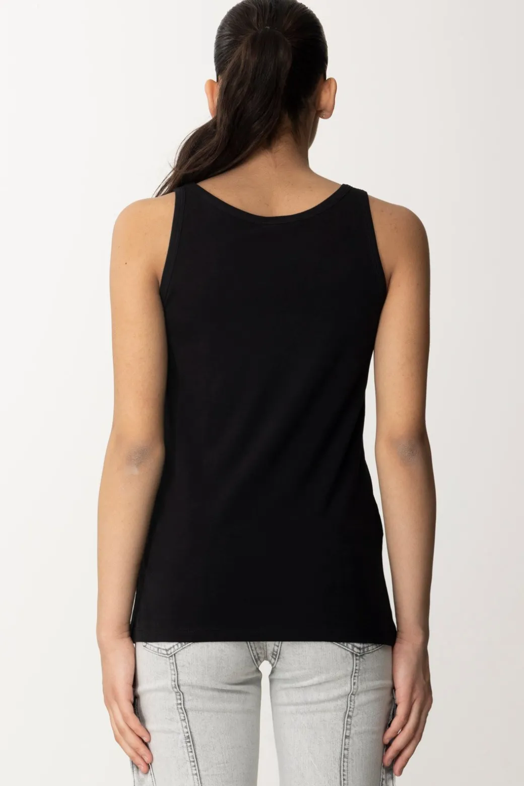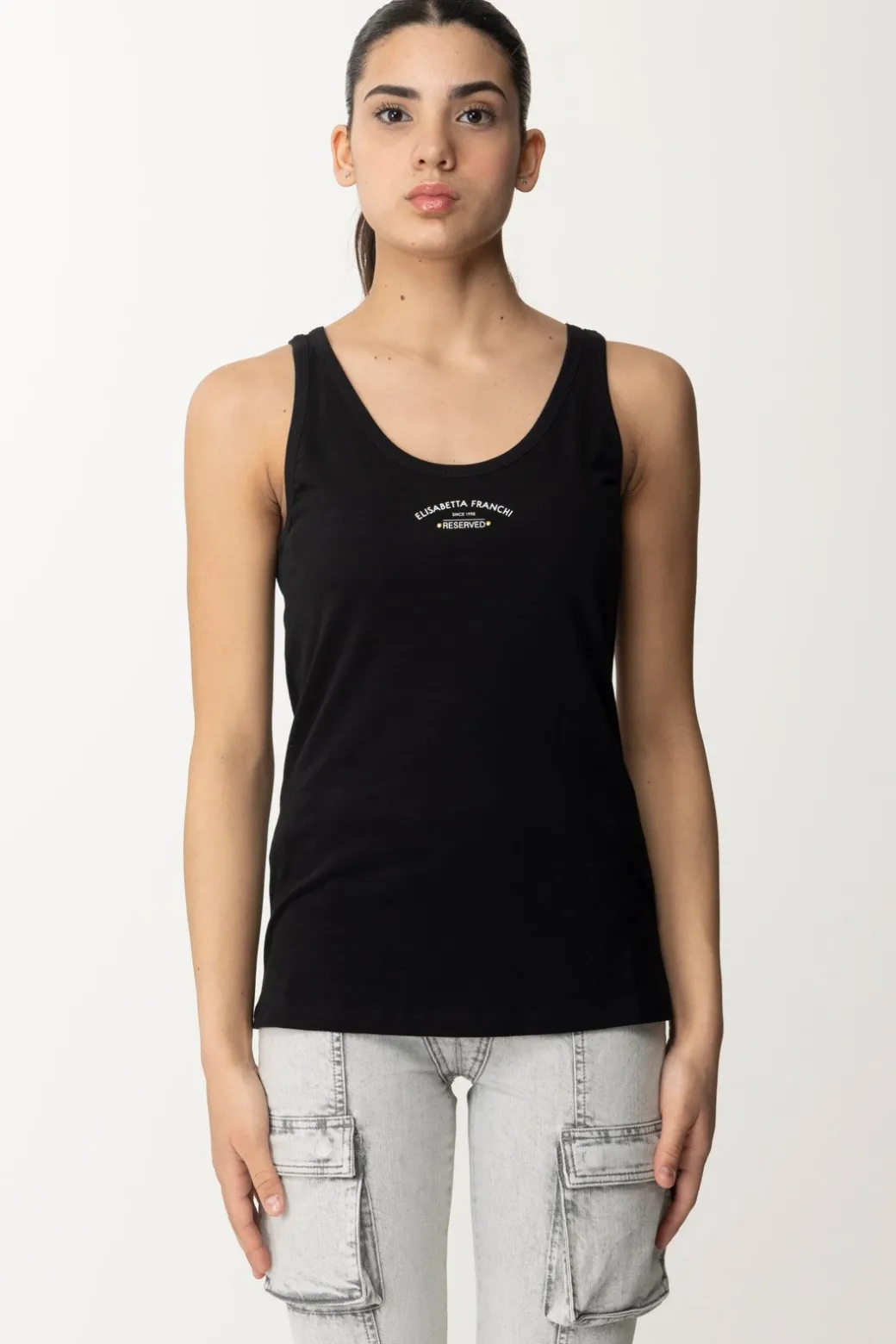 Indossa la semplicità con stile! La canotta Elisabetta Franchi, realizzata in morbido cotone e impreziosita da una stampa logo e micro rivetti gold, dona un look che grida di classe e originalità anche durante le giornate più minimal!