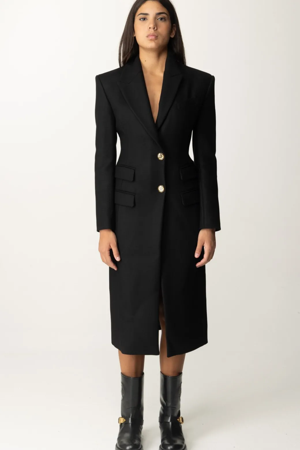 Elegante cappotto Elisabetta Franchi in crepep pesante, che cade lungo la sihlouette valorizzandola grazie alla marcata sfiancatura e al perfetto equilibrio creato dalle spalle strutturate e bilanciato dalle patte posizionate sui fianchi. Un classico dell’eleganza, da indossare per tutta la stagione from day to night.